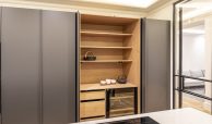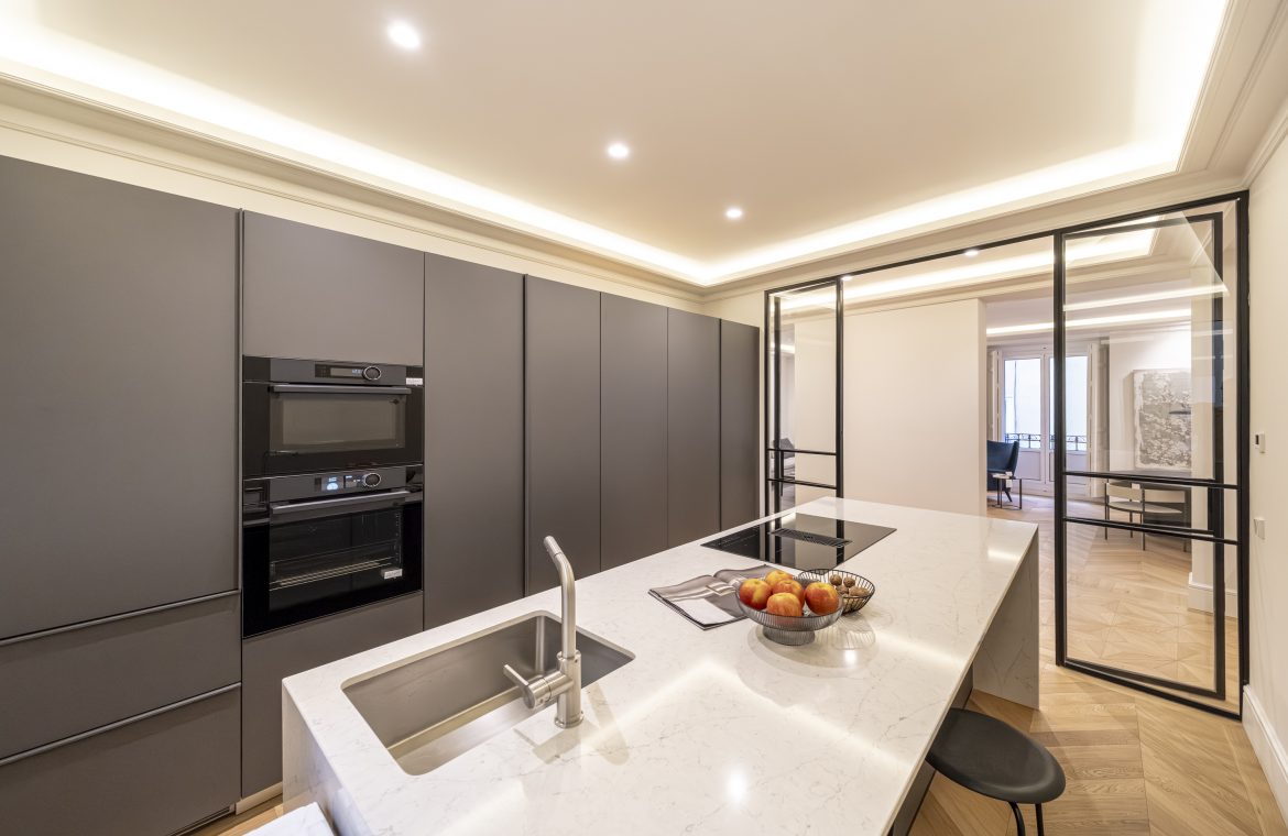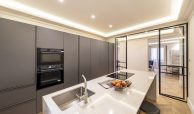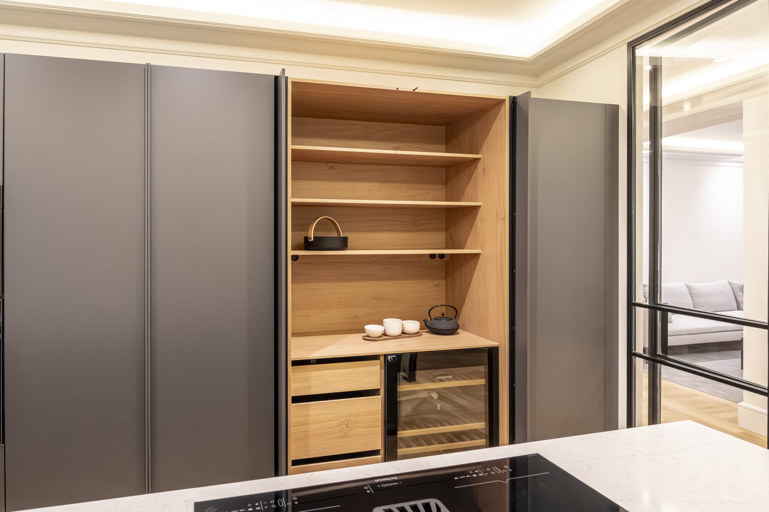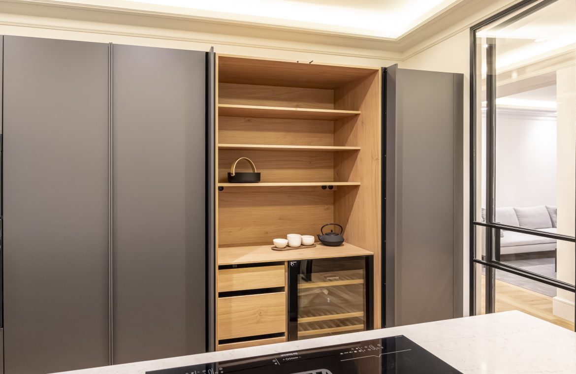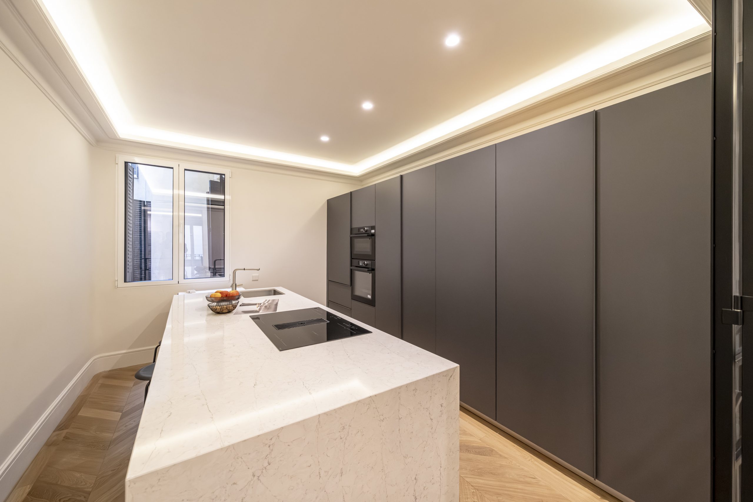 El salón-comedor con cocina americana constituye el corazón de la vivienda: un espacio abierto, moderno y funcional, perfecto tanto para el día a día como para recibir invitados. La cocina, de diseño contemporáneo, mantiene las mismas calidades premium, con mobiliario en tonos gris antracita y grafeno, sistema Gola, encimera de Silestone Pearl Jasmine y electrodomésticos de alta gama De Dietrich y Liebherr, incluyendo placa de inducción con campana integrada y vinoteca.