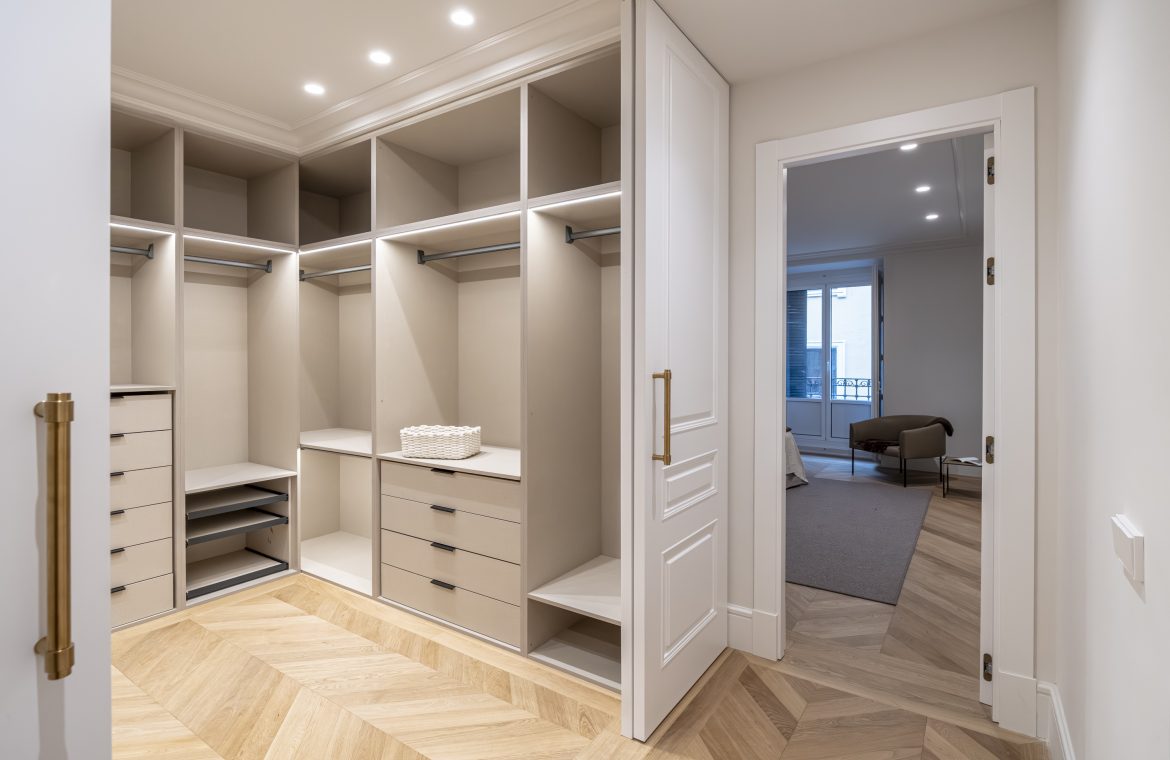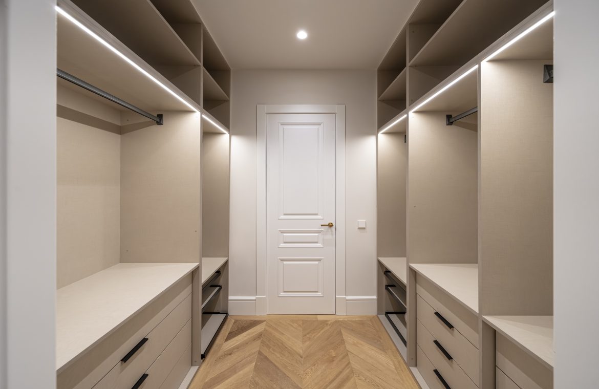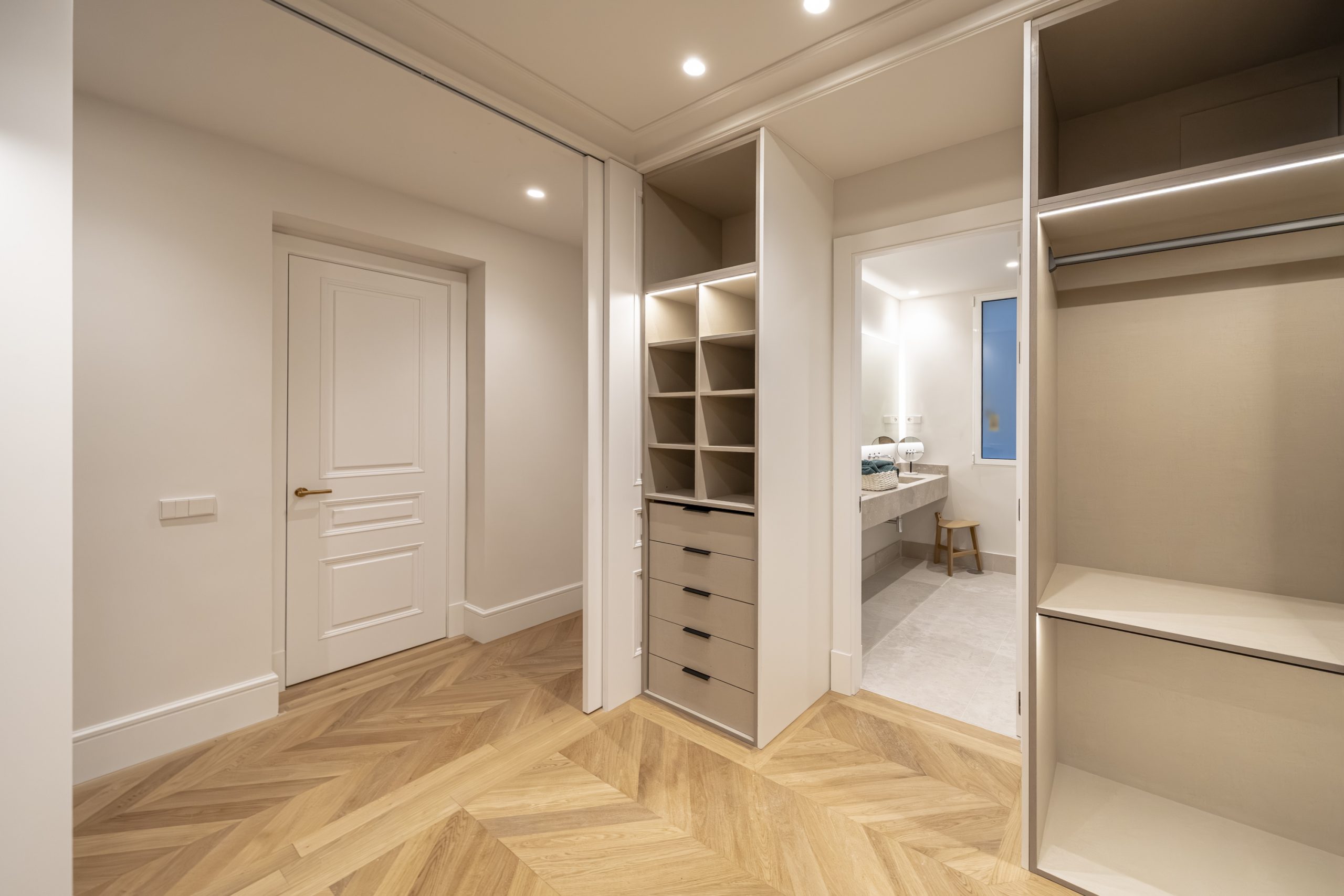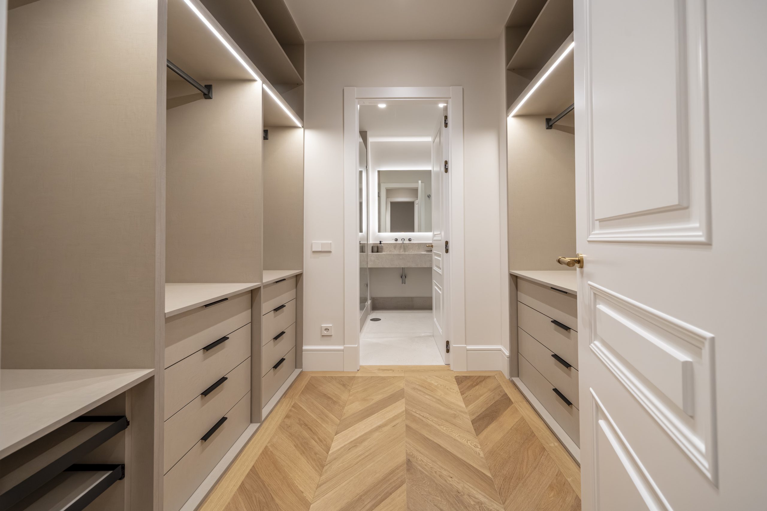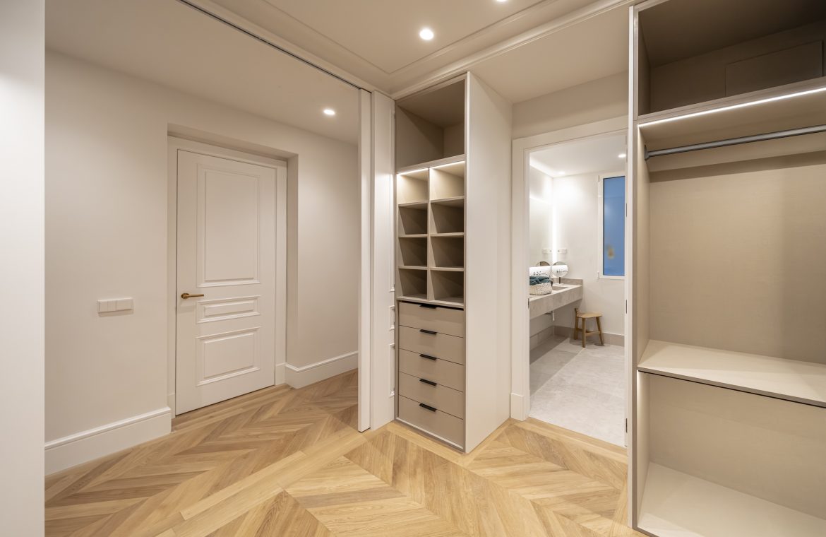 La carpintería interior a medida aporta un nivel superior de confort y orden, con armarios y vestidores realizados en DM lacado en blanco, interiores en melamina tipo textil de 16 mm, cajones de extracción total con freno, barras de colgar e iluminación LED integrada, rematados con elegantes tiradores acabado Titanium Gold.