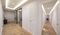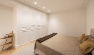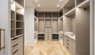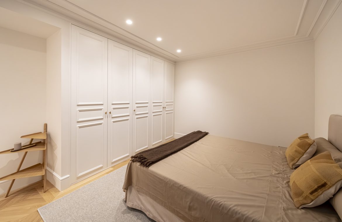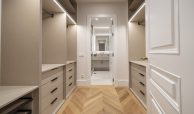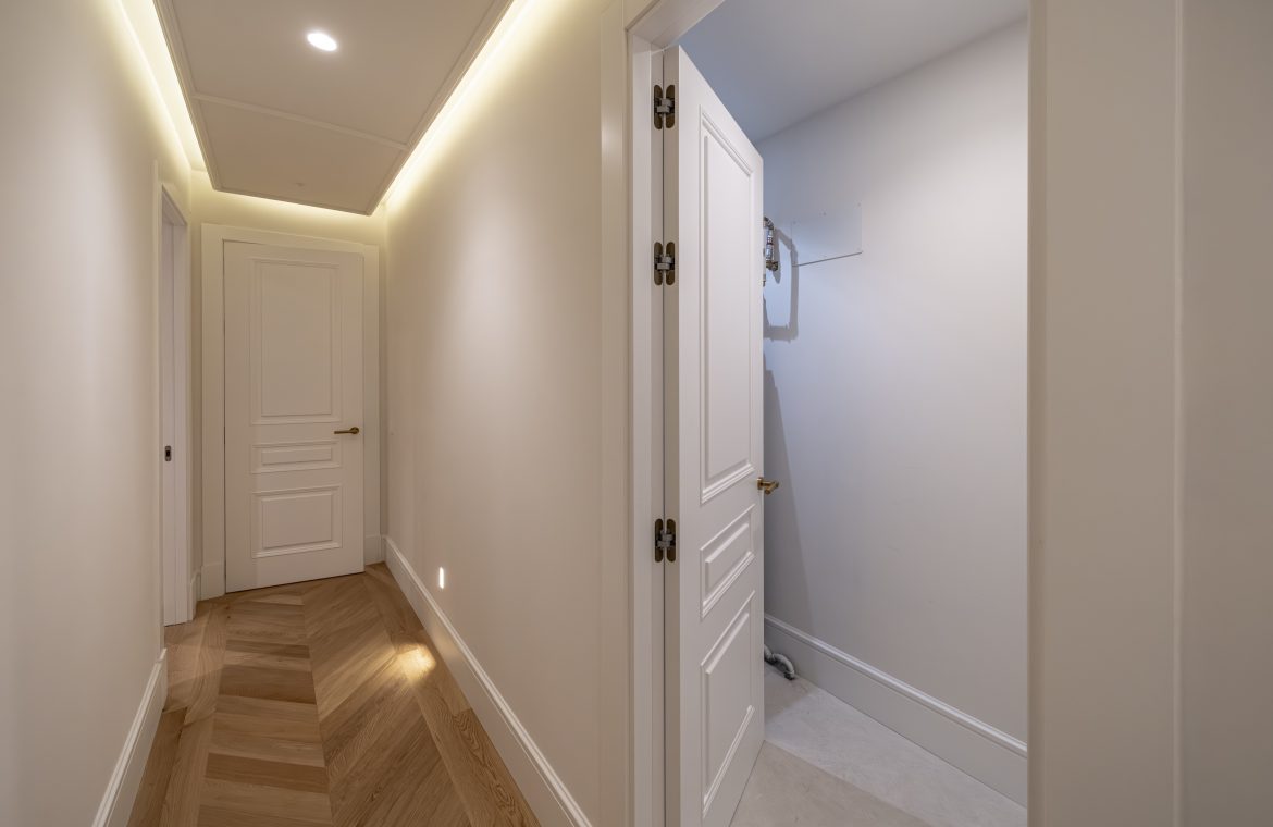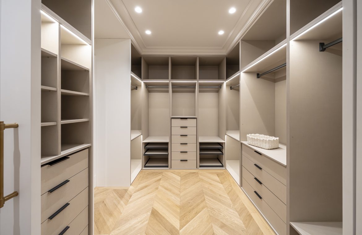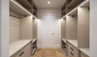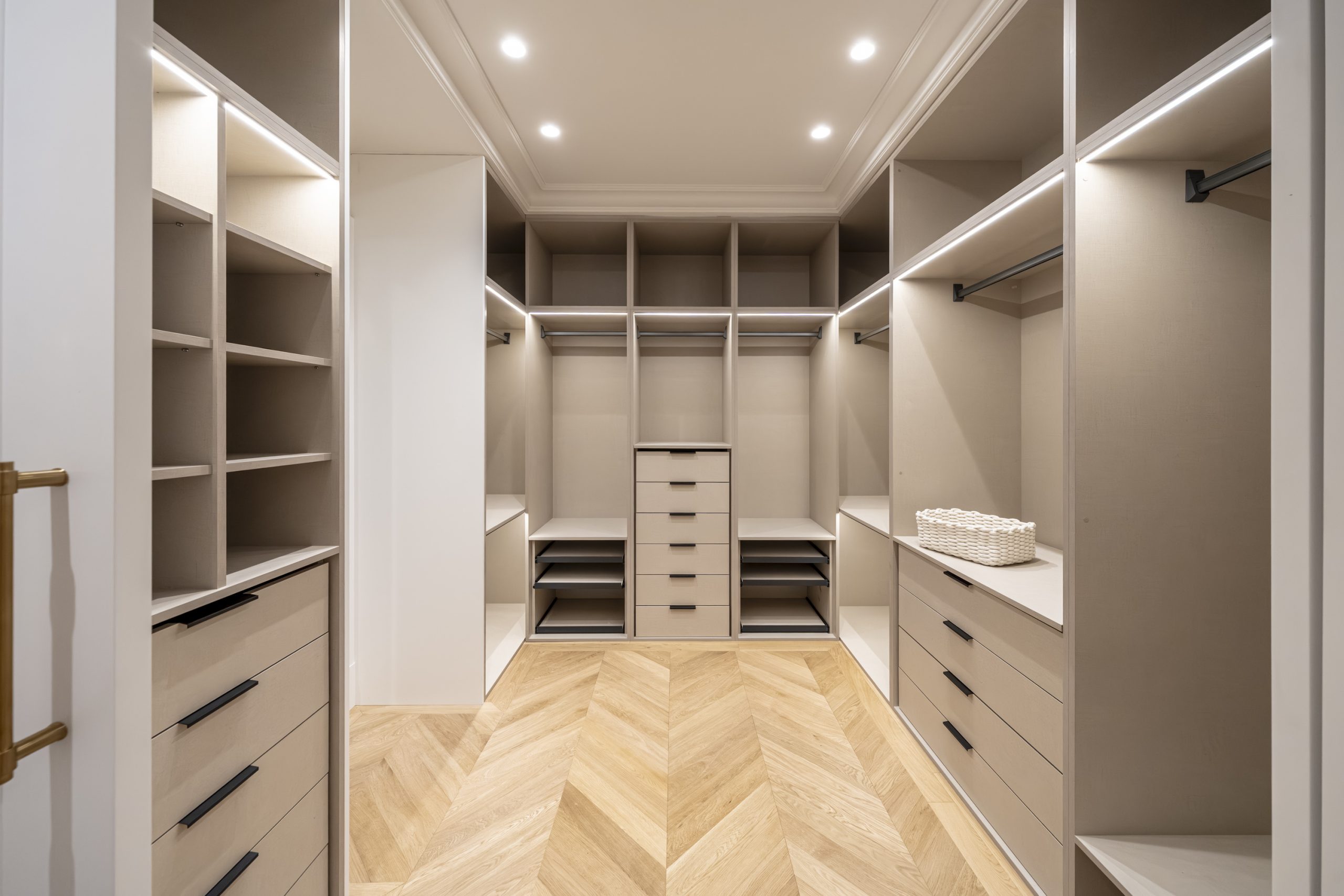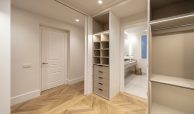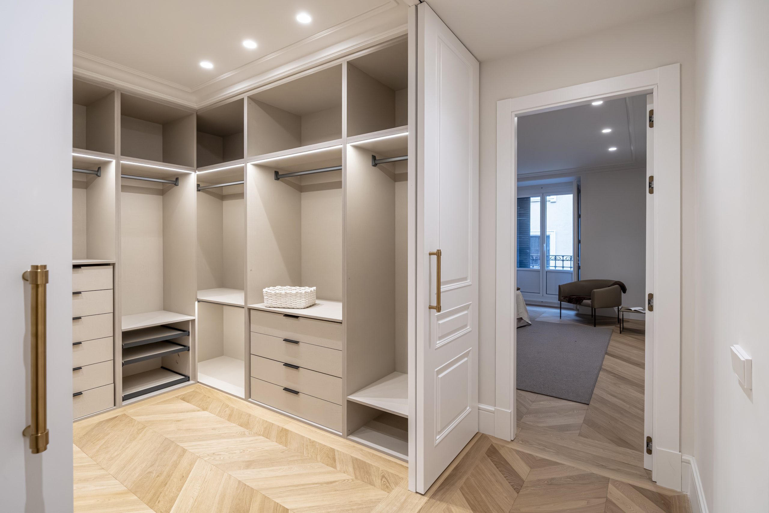 La carpintería interior a medida aporta un nivel superior de confort y orden, con armarios y vestidores realizados en DM lacado en blanco, interiores en melamina tipo textil de 16 mm, cajones de extracción total con freno, barras de colgar e iluminación LED integrada, rematados con elegantes tiradores acabado Titanium Gold.