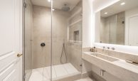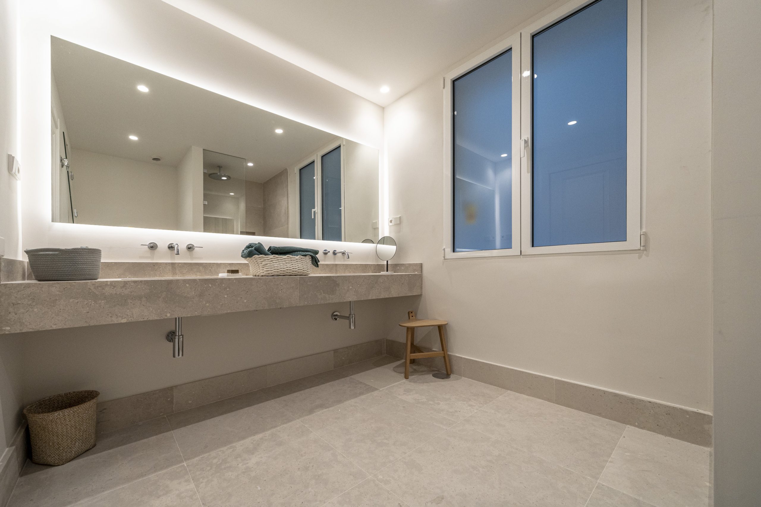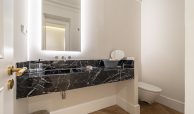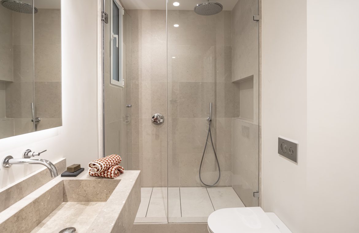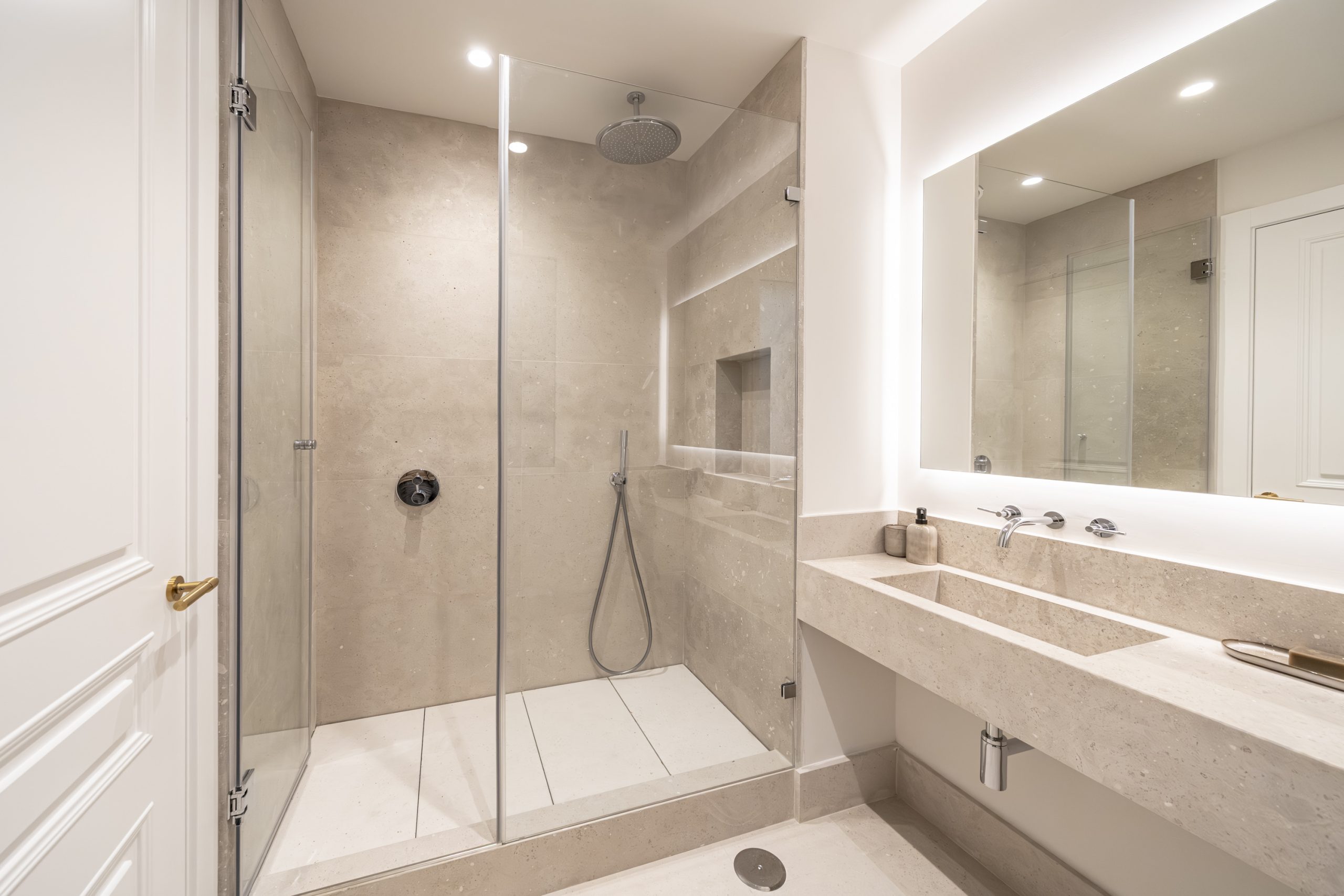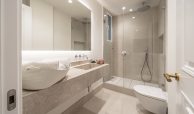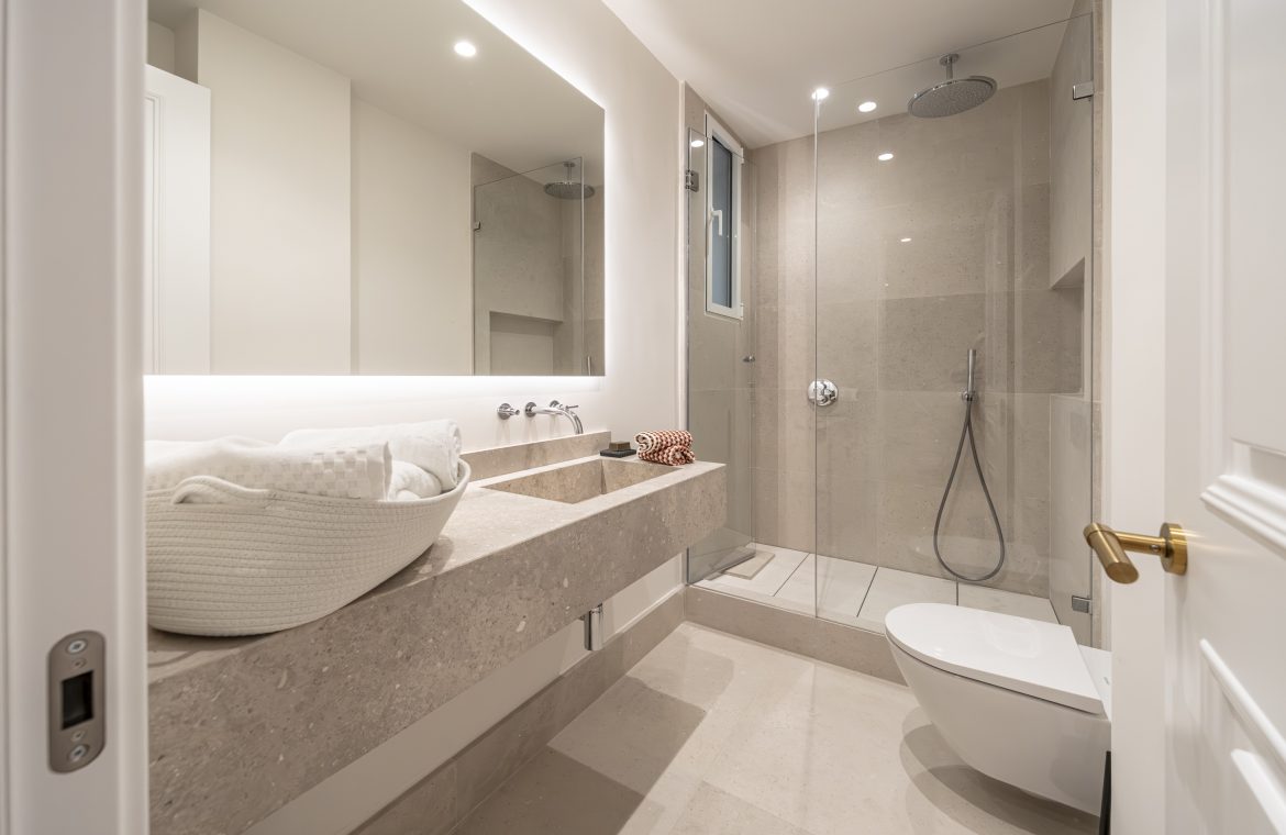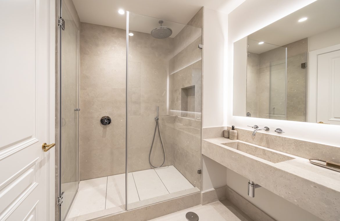 Los cuartos de baño han sido concebidos con un enfoque spa, incorporando duchas de obra revestidas en piedra natural, mamparas de vidrio laminado y templado con perfilería en acero inoxidable, griferías empotradas Grohe modelo Atrio, inodoros suspendidos Duravit y muebles de baño con frentes en roble natural. Las encimeras en Negro Marquina y piedra de Campaspero aportan una estética atemporal y exclusiva.