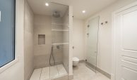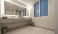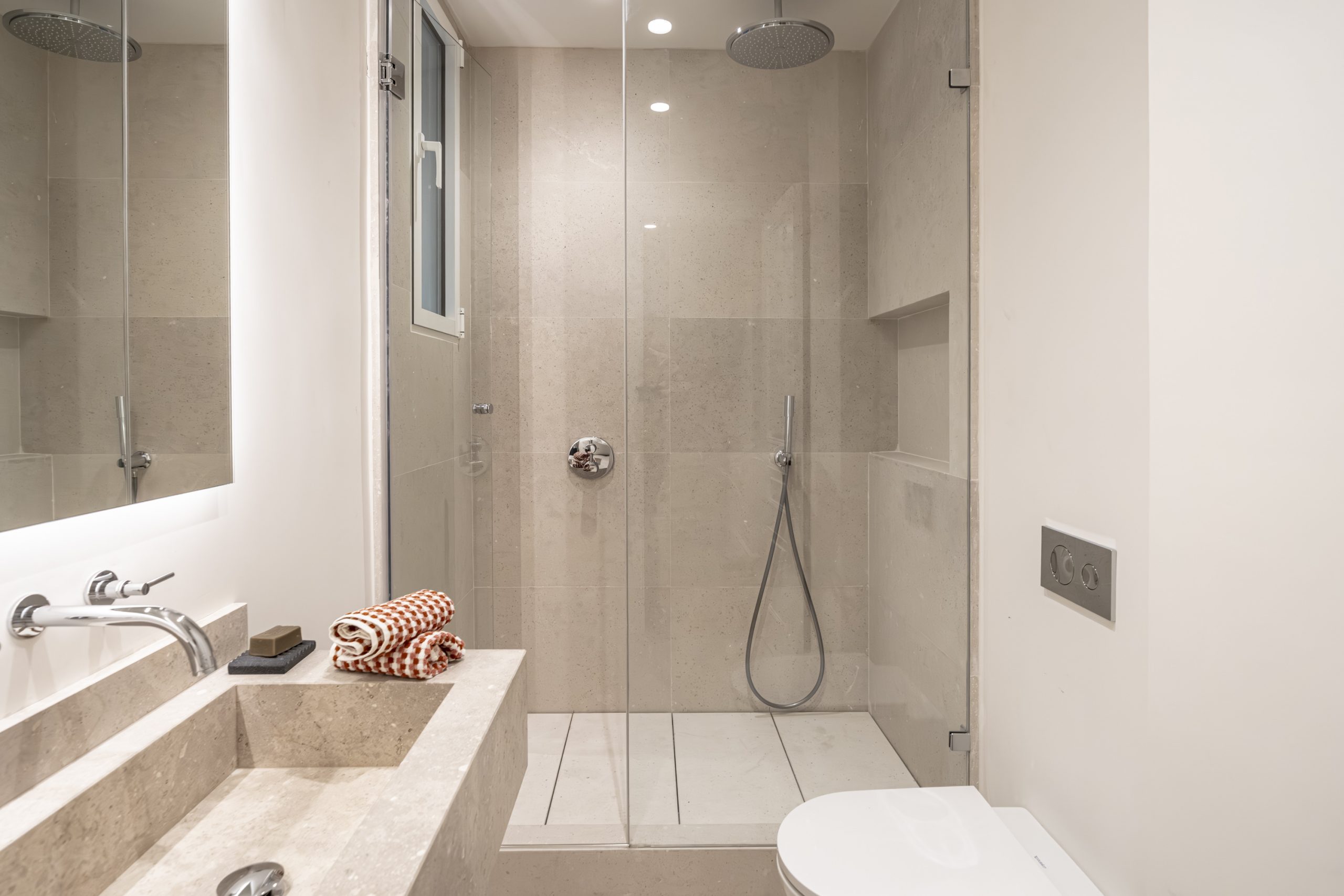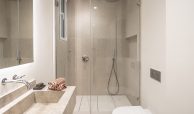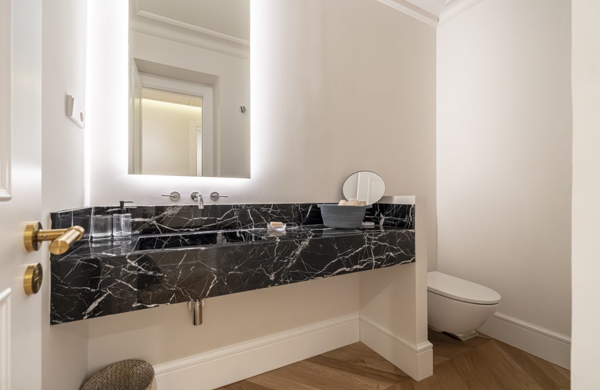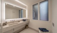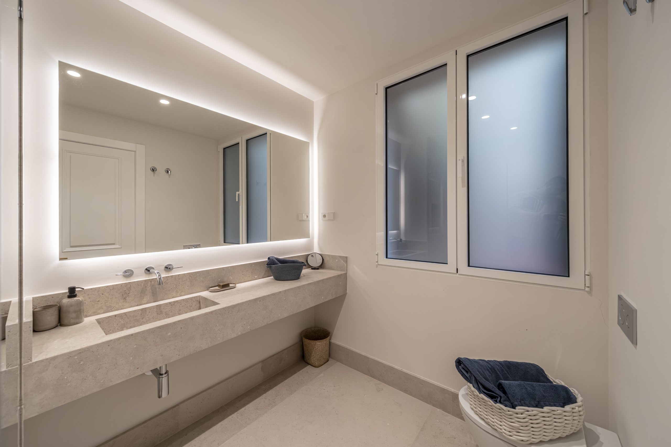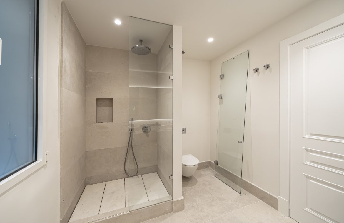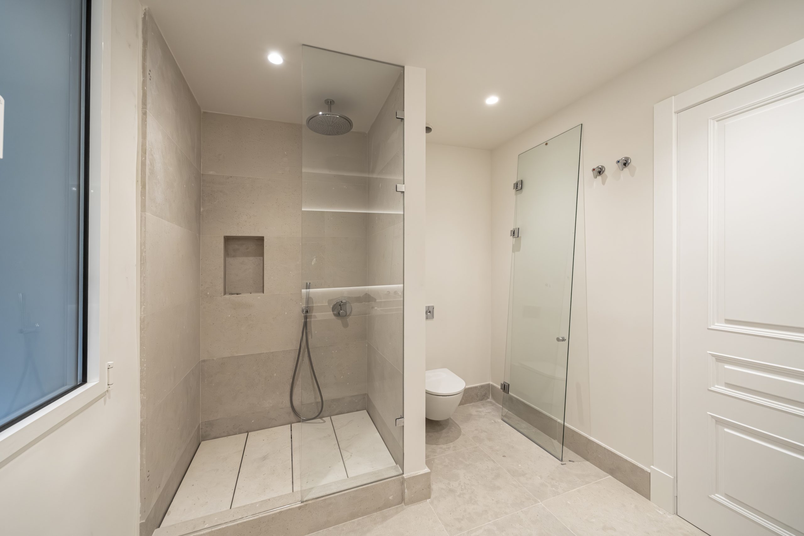 Los cuartos de baño han sido concebidos con un enfoque spa, incorporando duchas de obra revestidas en piedra natural, mamparas de vidrio laminado y templado con perfilería en acero inoxidable, griferías empotradas Grohe modelo Atrio, inodoros suspendidos Duravit y muebles de baño con frentes en roble natural. Las encimeras en Negro Marquina y piedra de Campaspero aportan una estética atemporal y exclusiva.
