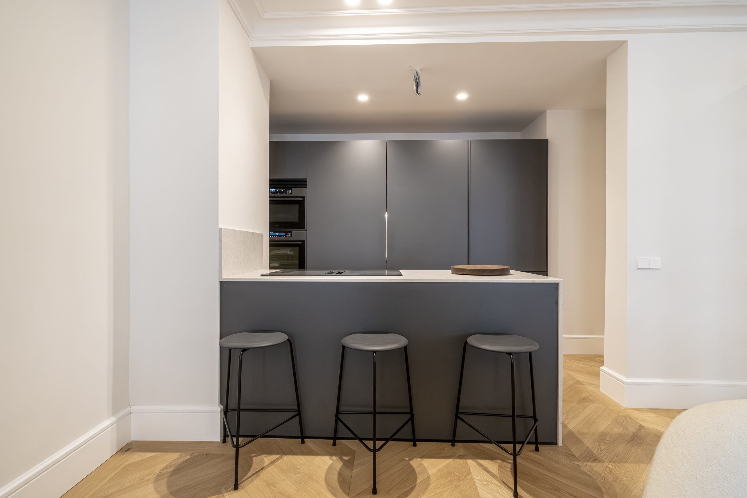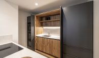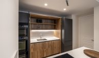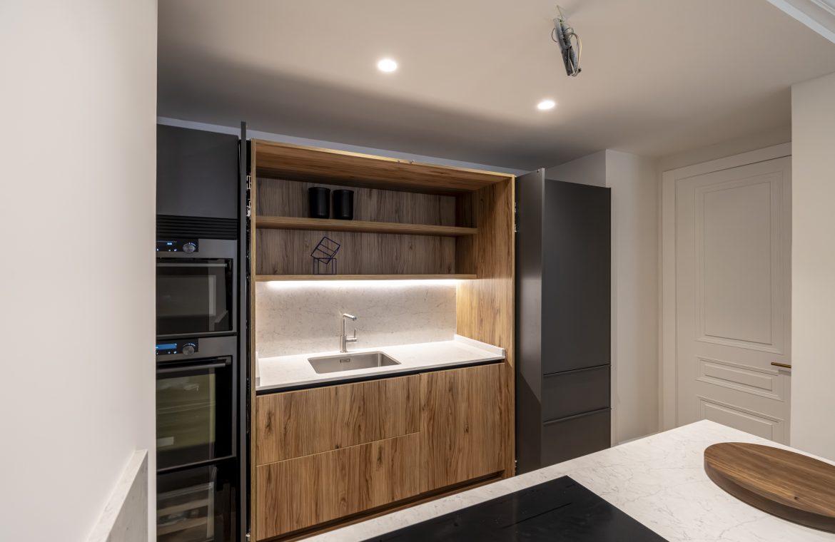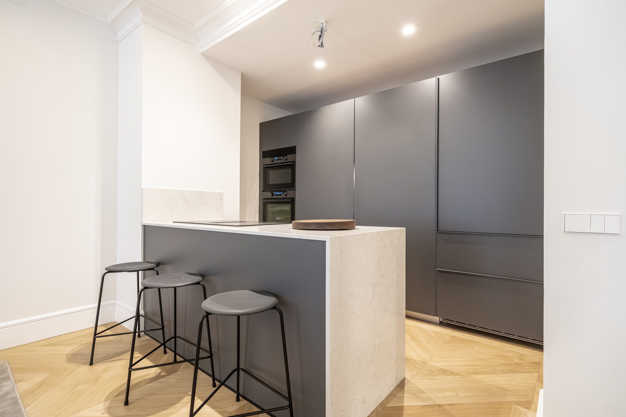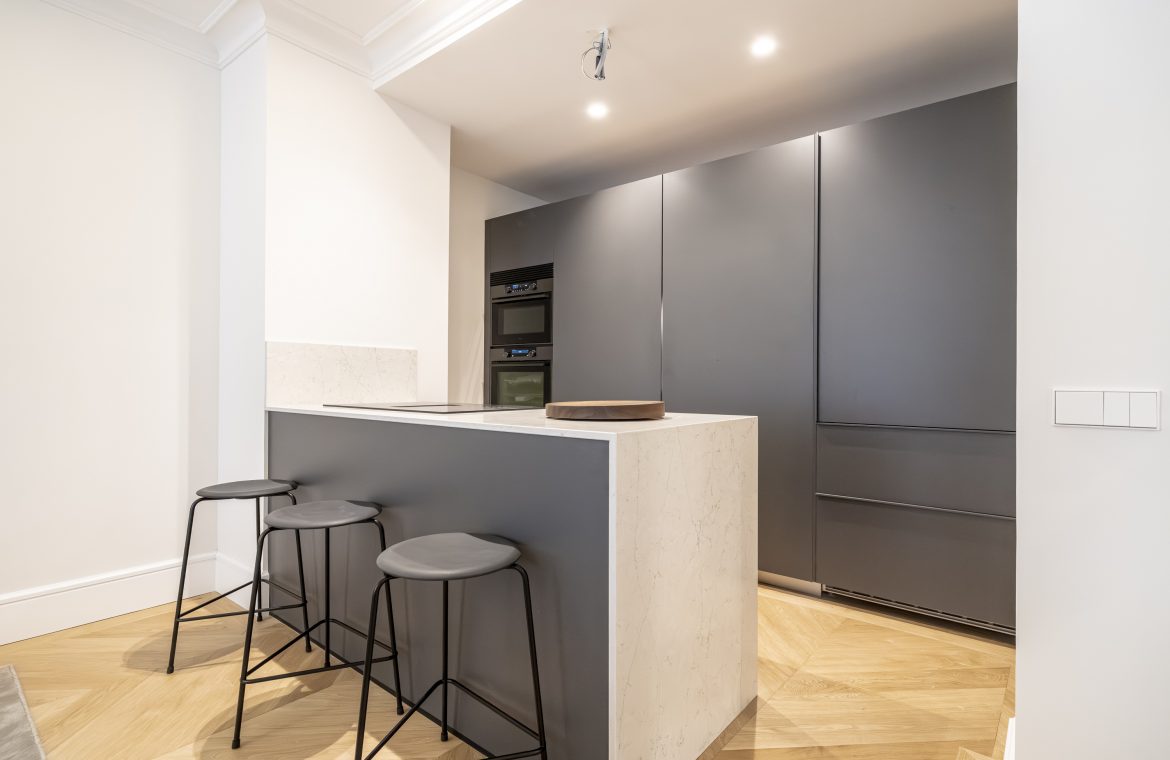 La cocina, de diseño contemporáneo, combina frentes estratificados en gris antracita y grafeno, con sistema Gola lacado y cajones de alta gama. Está equipada con electrodomésticos De Dietrich y Liebherr, incluyendo frigorífico, lavavajillas, horno, microondas, vinoteca y placa de inducción con campana integrada. La encimera de Silestone Pearl Jasmine, con canto recto de 2 cm, aporta elegancia y resistencia, mientras que el fregadero Andano y el grifo Lanora completan un conjunto de máxima calidad.