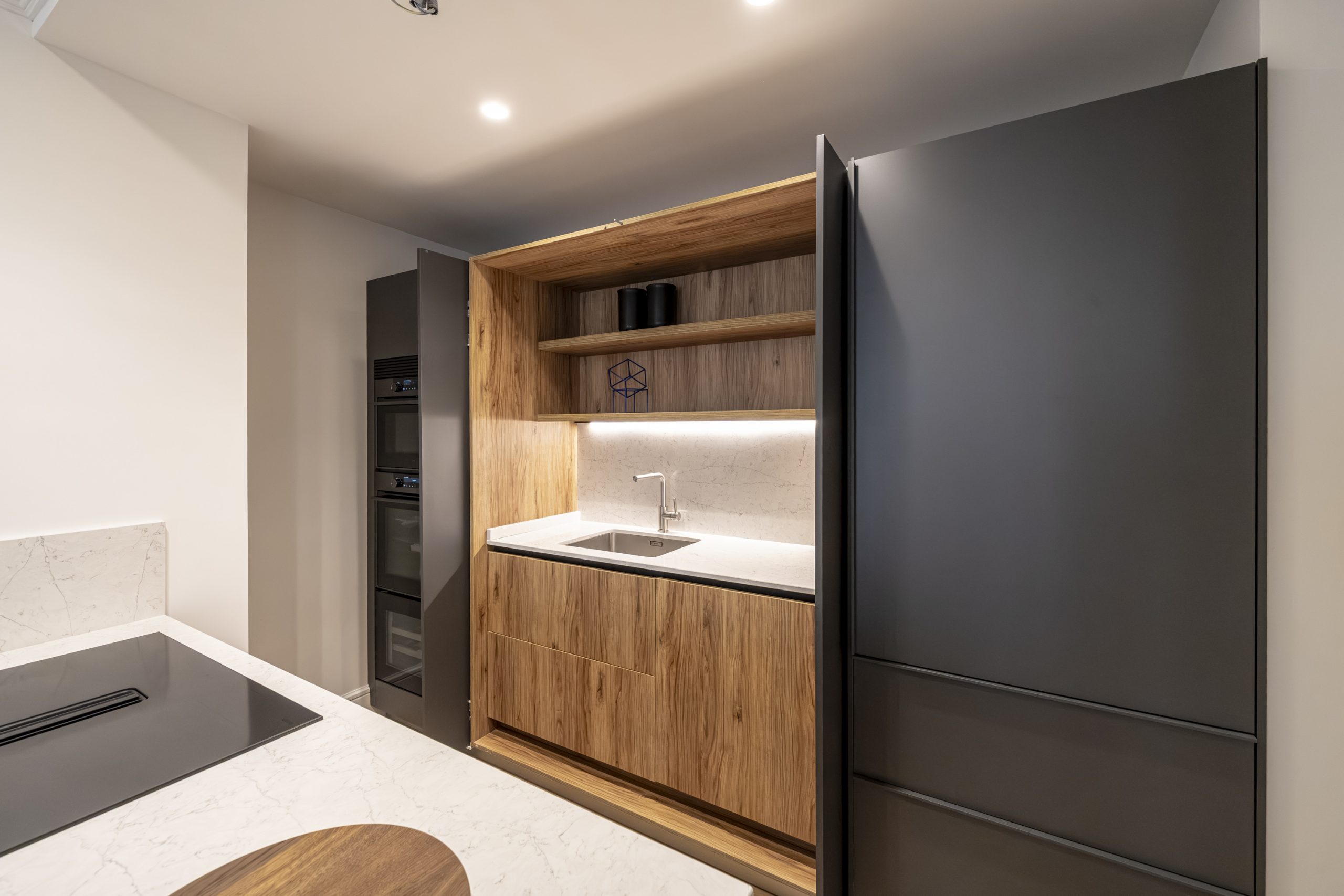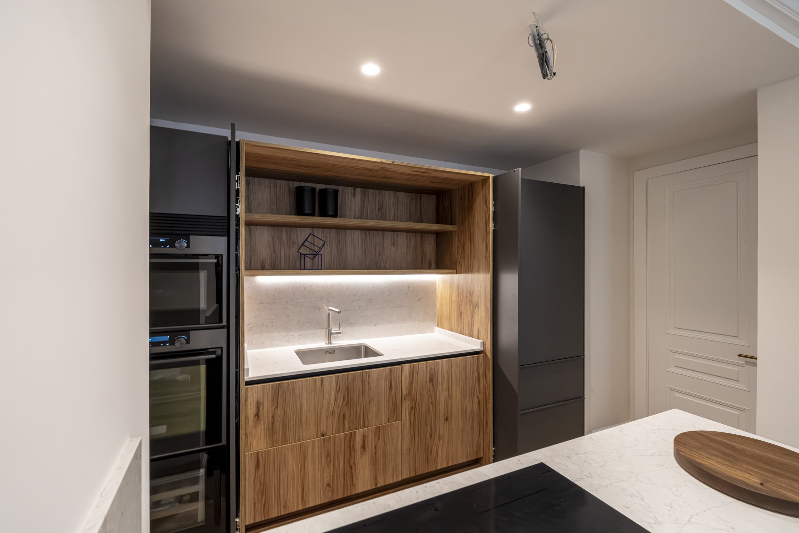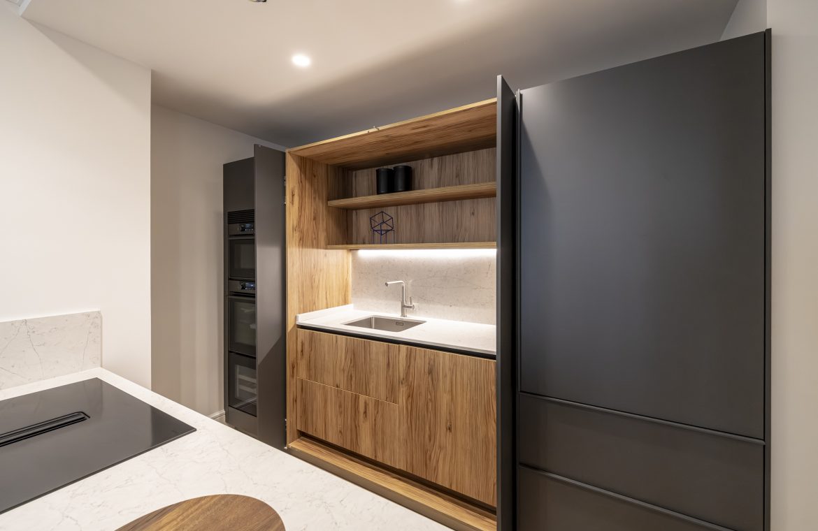La cocina, de diseño contemporáneo, combina frentes estratificados en gris antracita y grafeno, con sistema Gola lacado y cajones de alta gama. Está equipada con electrodomésticos De Dietrich y Liebherr, incluyendo frigorífico, lavavajillas, horno, microondas, vinoteca y placa de inducción con campana integrada. La encimera de Silestone Pearl Jasmine, con canto recto de 2 cm, aporta elegancia y resistencia, mientras que el fregadero Andano y el grifo Lanora completan un conjunto de máxima calidad.
