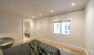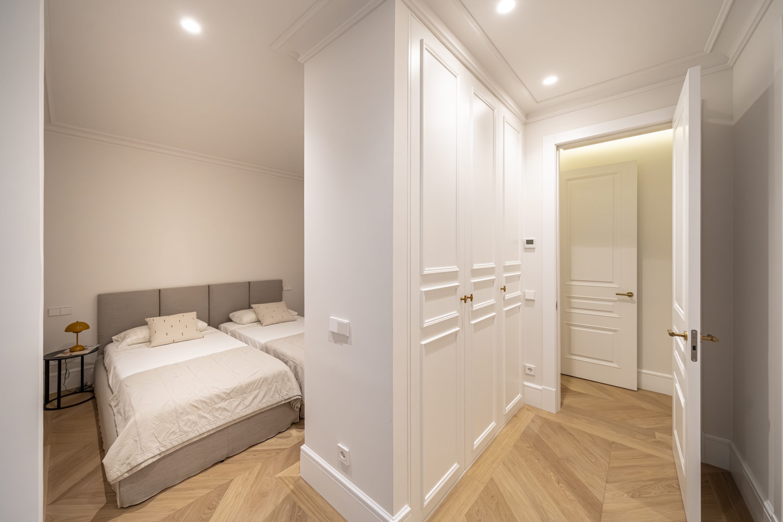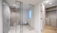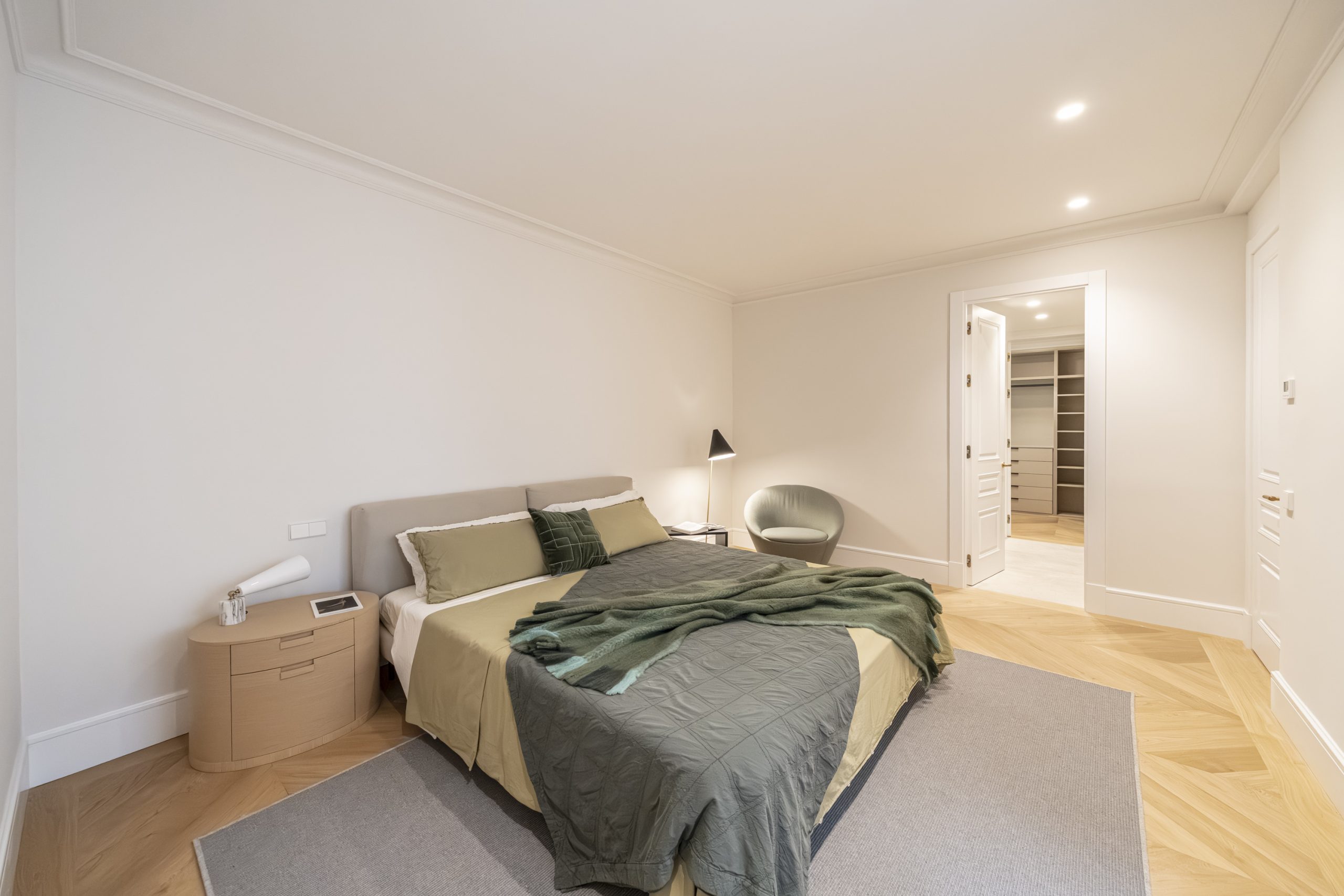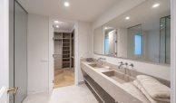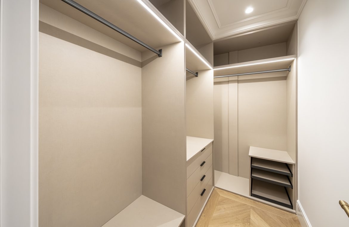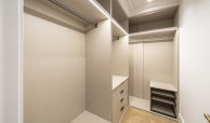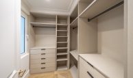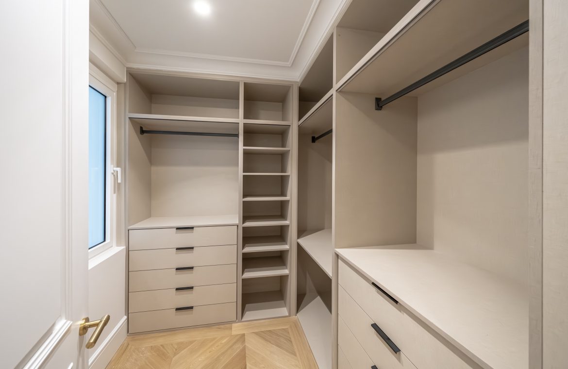 El dormitorio principal y vestidor destacan por su cuidada carpintería a medida, con interiores en melamina textil de 16 mm, cajones con extracción total y freno, barras de colgar y iluminación LED integrada. Los armarios presentan puertas de DM lacadas en blanco, frentes con molduras decorativas y elegantes tiradores acabado Titanium Gold, aportando un carácter sofisticado y atemporal.