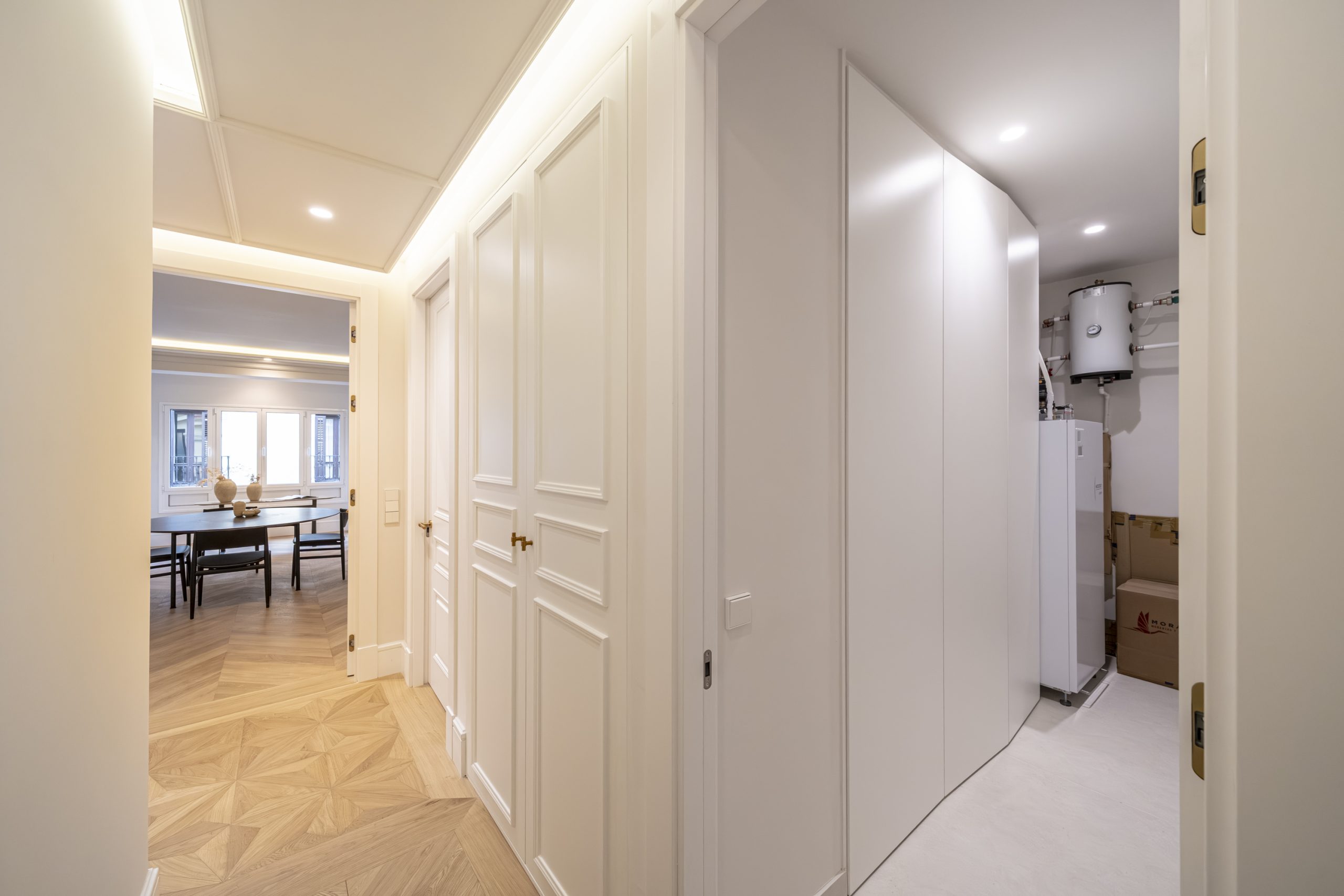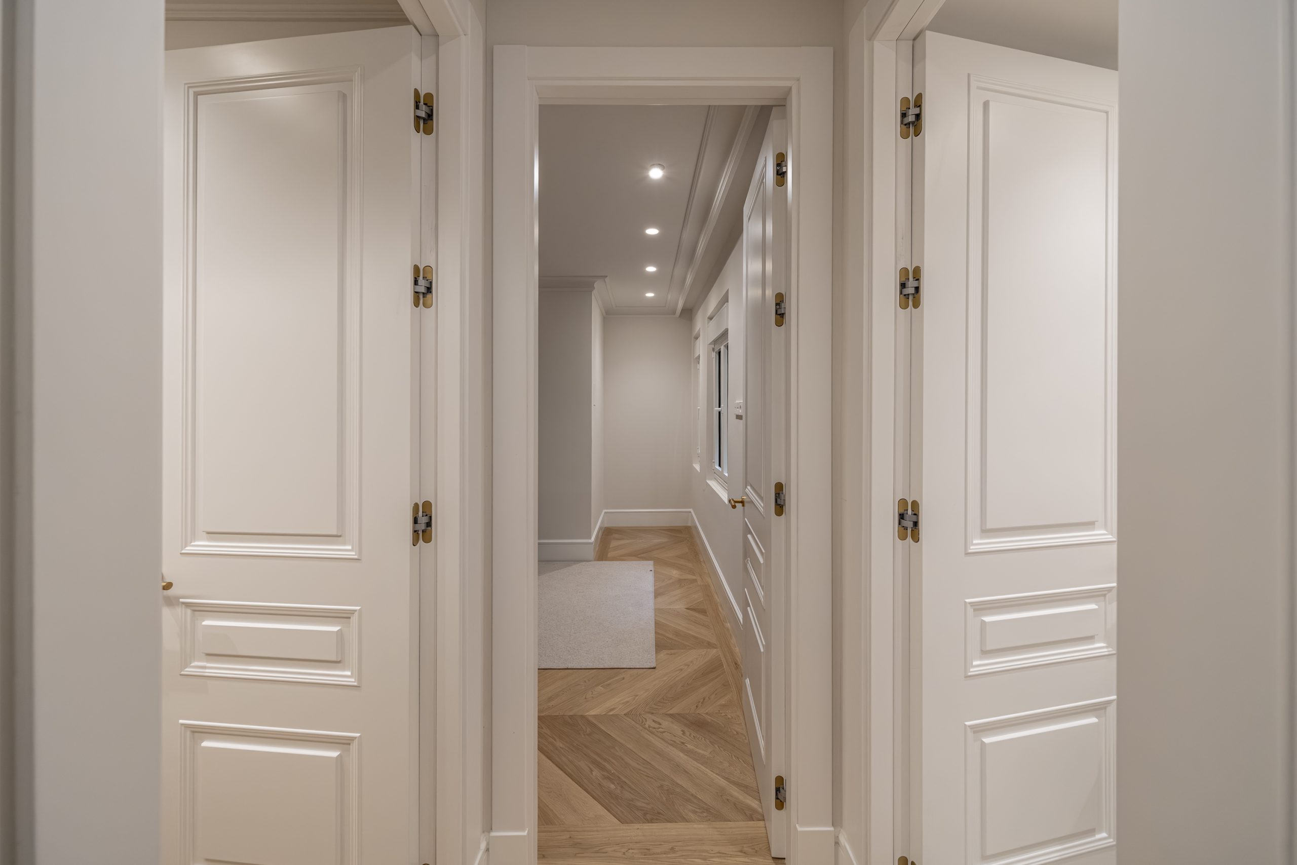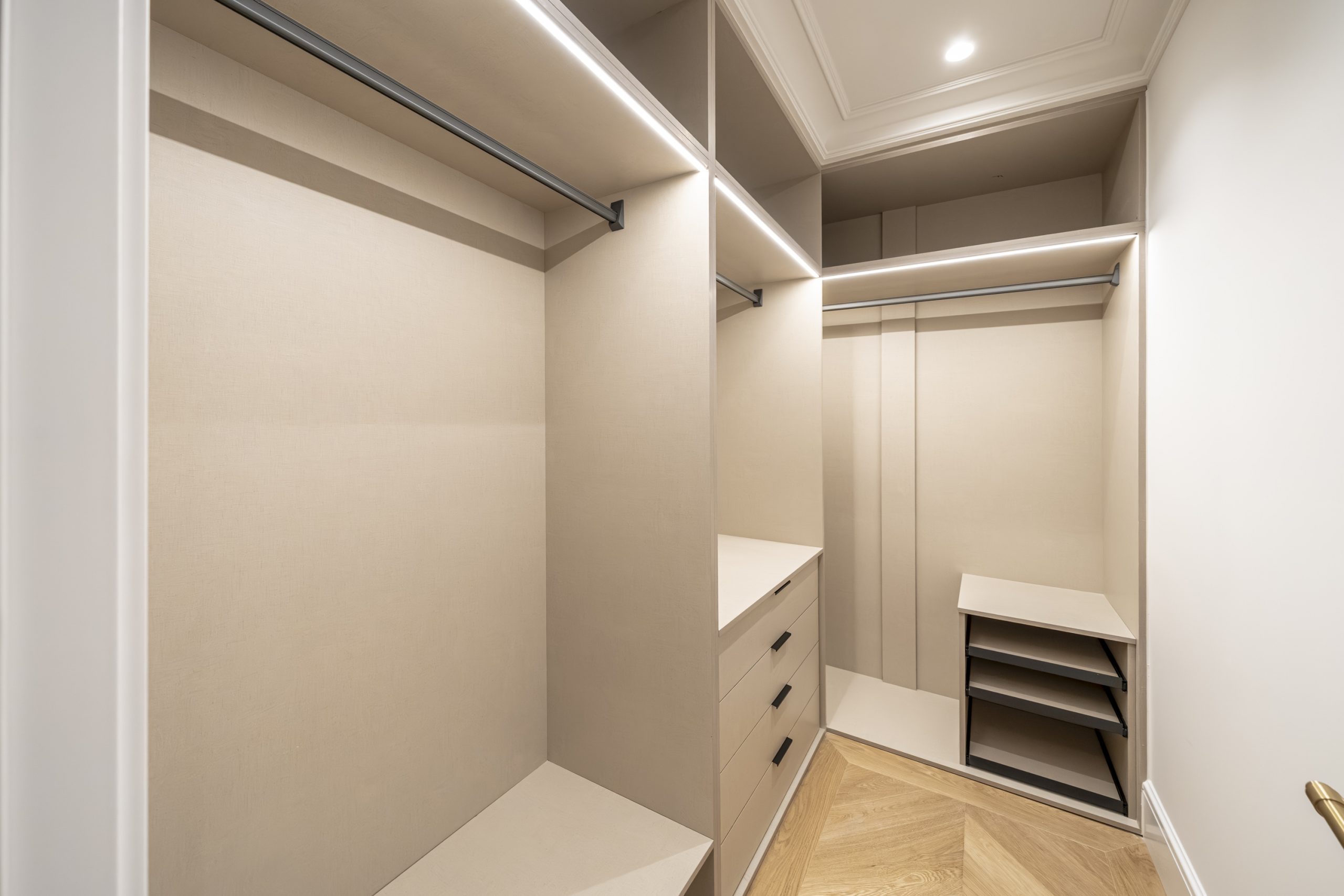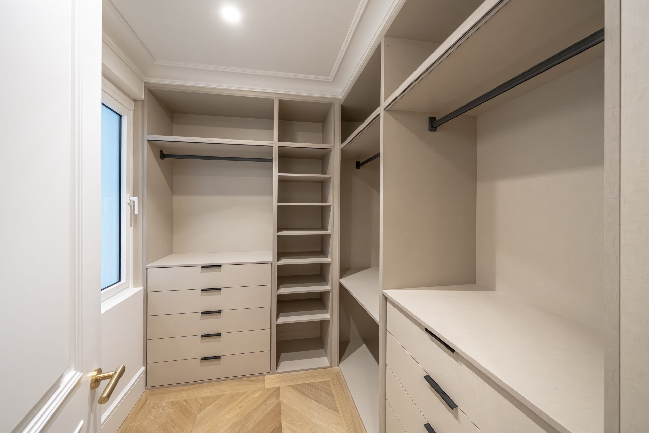 El dormitorio principal y vestidor destacan por su cuidada carpintería a medida, con interiores en melamina textil de 16 mm, cajones con extracción total y freno, barras de colgar y iluminación LED integrada. Los armarios presentan puertas de DM lacadas en blanco, frentes con molduras decorativas y elegantes tiradores acabado Titanium Gold, aportando un carácter sofisticado y atemporal.