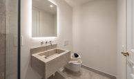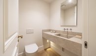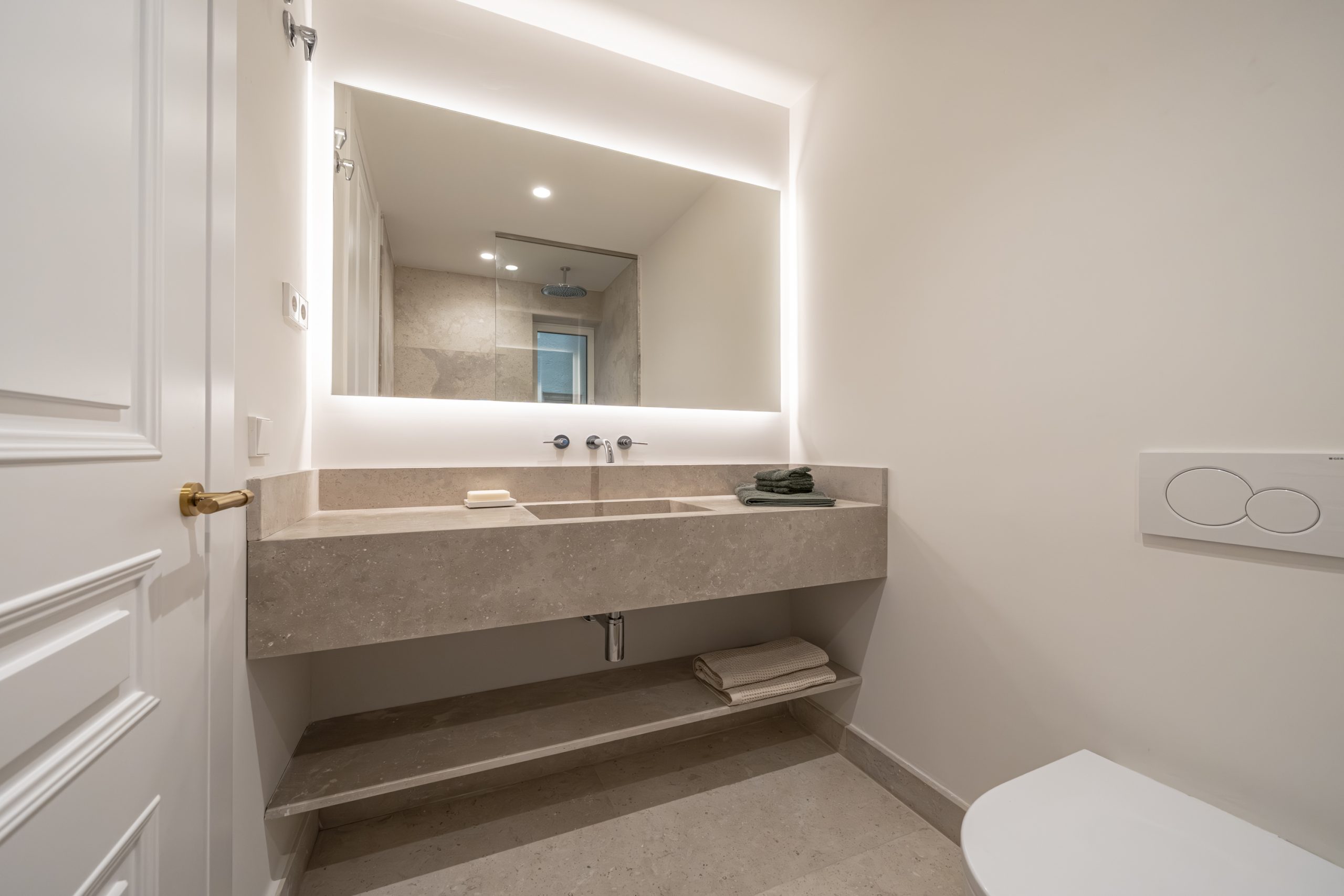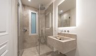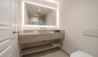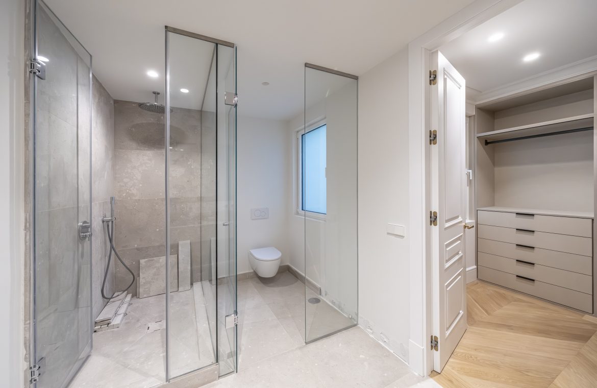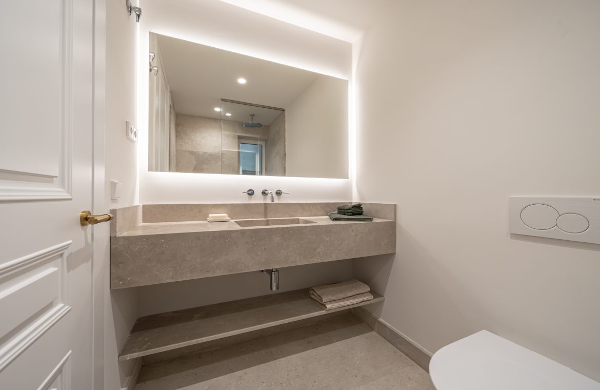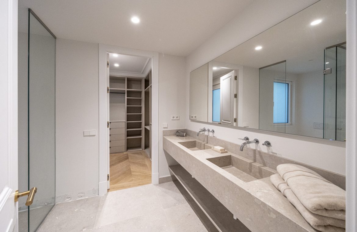 Los cuartos de baño han sido concebidos como auténticos espacios de bienestar. Disponen de duchas de obra revestidas en piedra natural, mamparas de vidrio laminado y templado con perfilería en acero inoxidable, griferías empotradas Grohe modelo Atrio, inodoros suspendidos Duravit con cisterna empotrada y muebles de baño con frentes en roble natural. Destacan las encimeras en mármol Negro Marquina y piedra de Campaspero, así como los espejos retroiluminados.