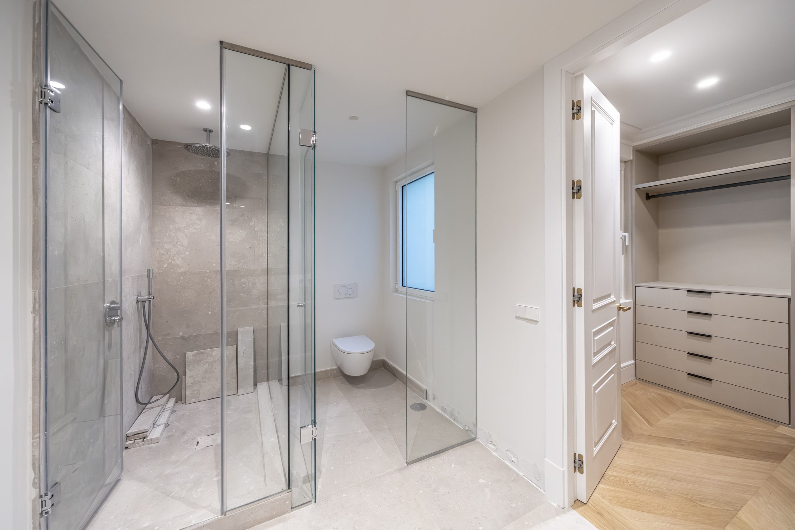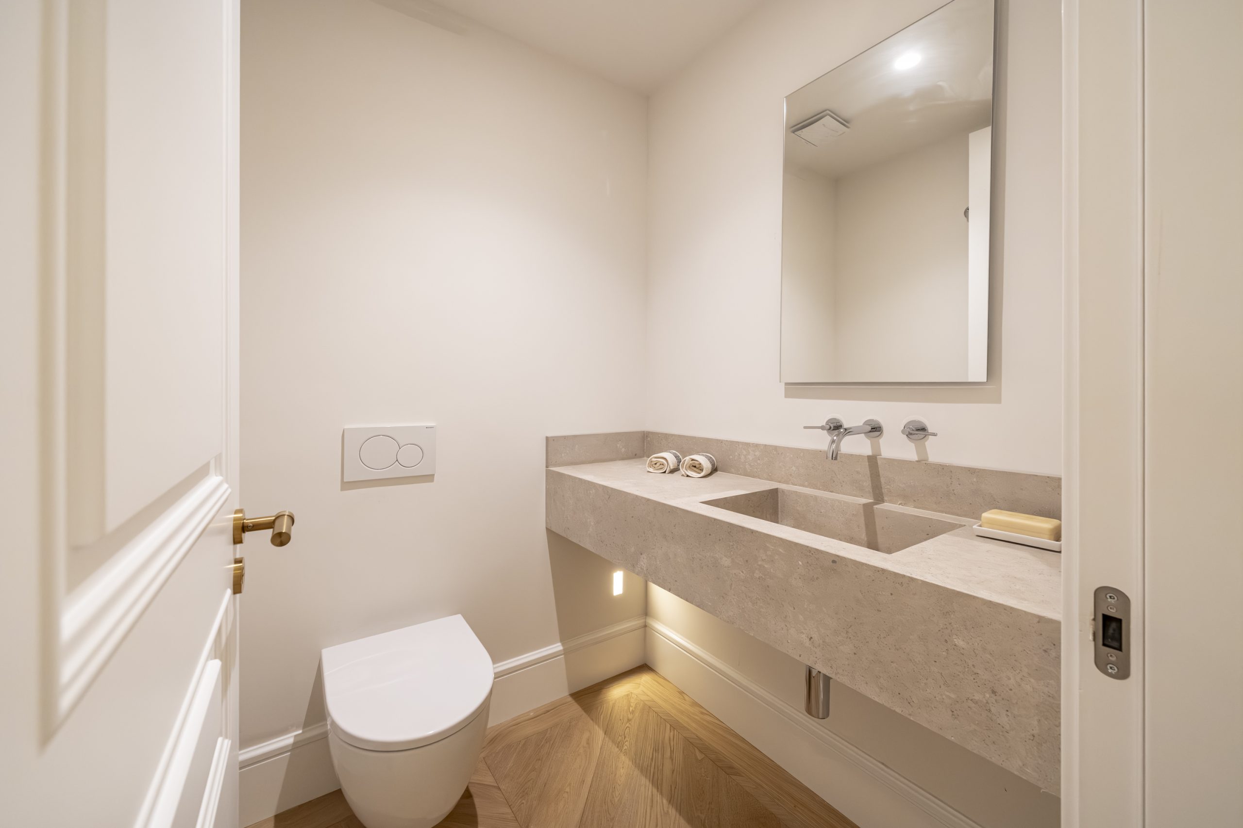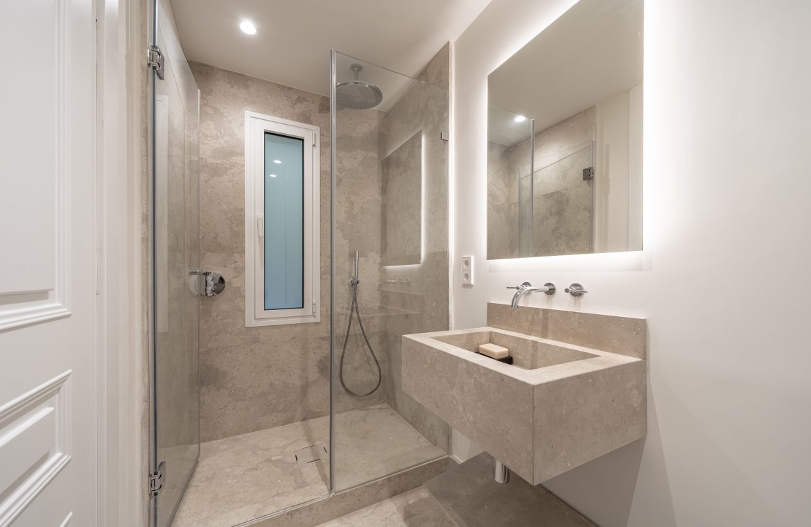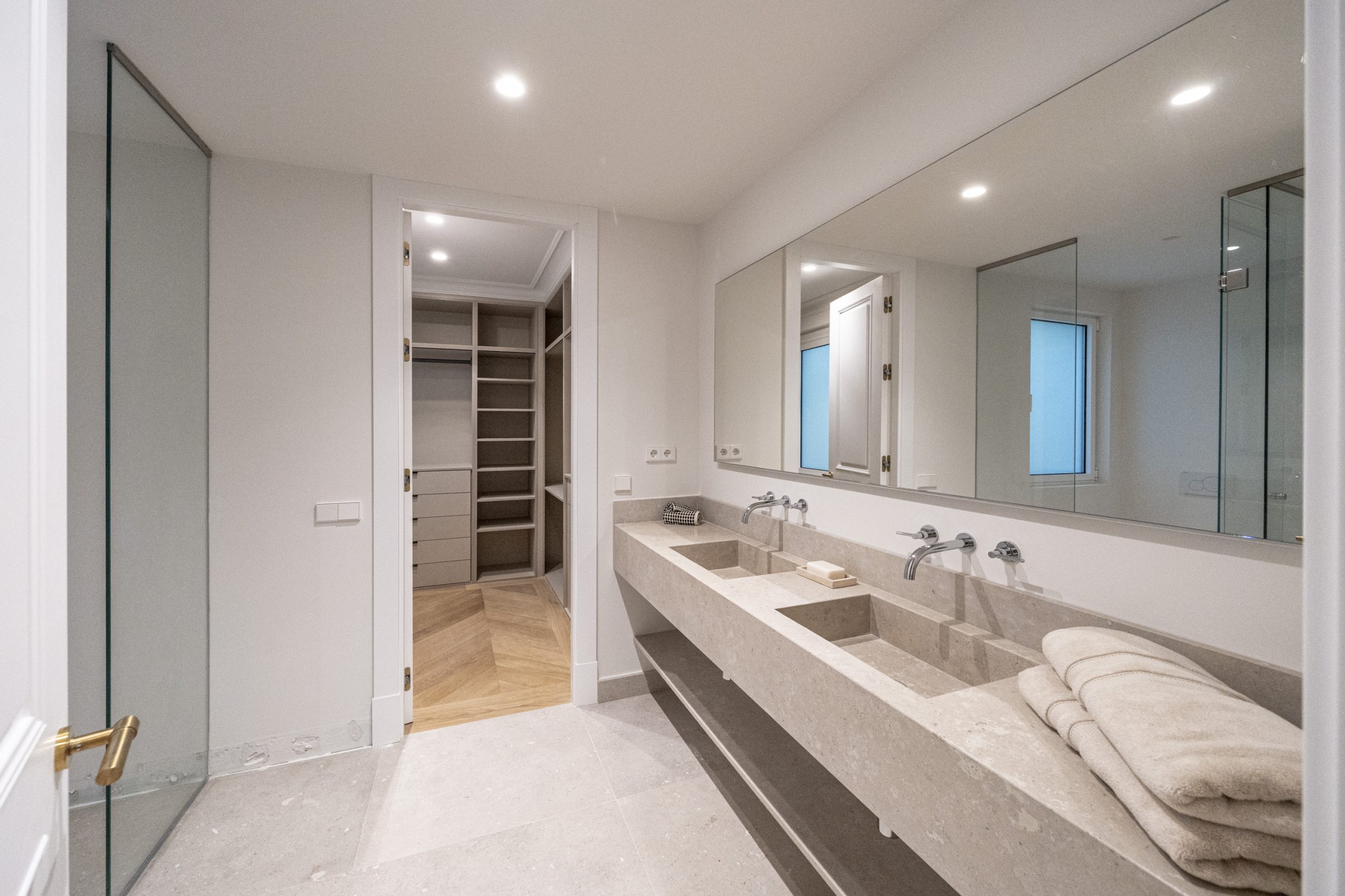 Los cuartos de baño han sido concebidos como auténticos espacios de bienestar. Disponen de duchas de obra revestidas en piedra natural, mamparas de vidrio laminado y templado con perfilería en acero inoxidable, griferías empotradas Grohe modelo Atrio, inodoros suspendidos Duravit con cisterna empotrada y muebles de baño con frentes en roble natural. Destacan las encimeras en mármol Negro Marquina y piedra de Campaspero, así como los espejos retroiluminados.