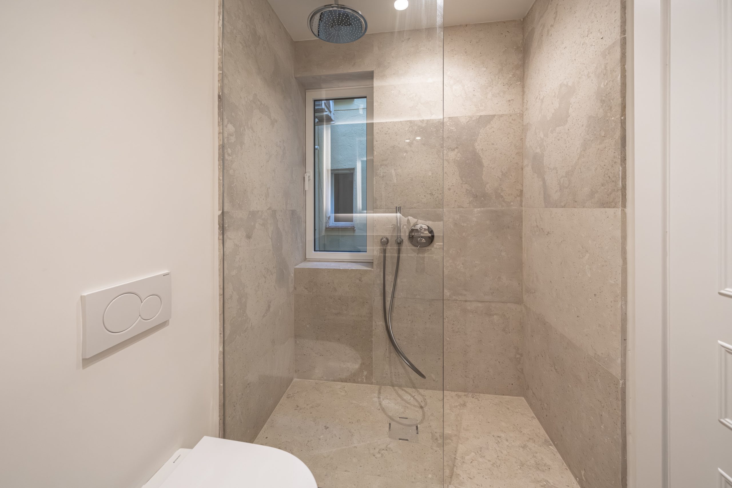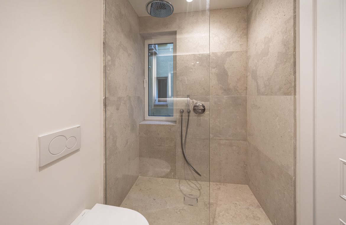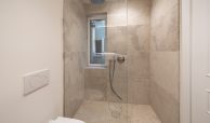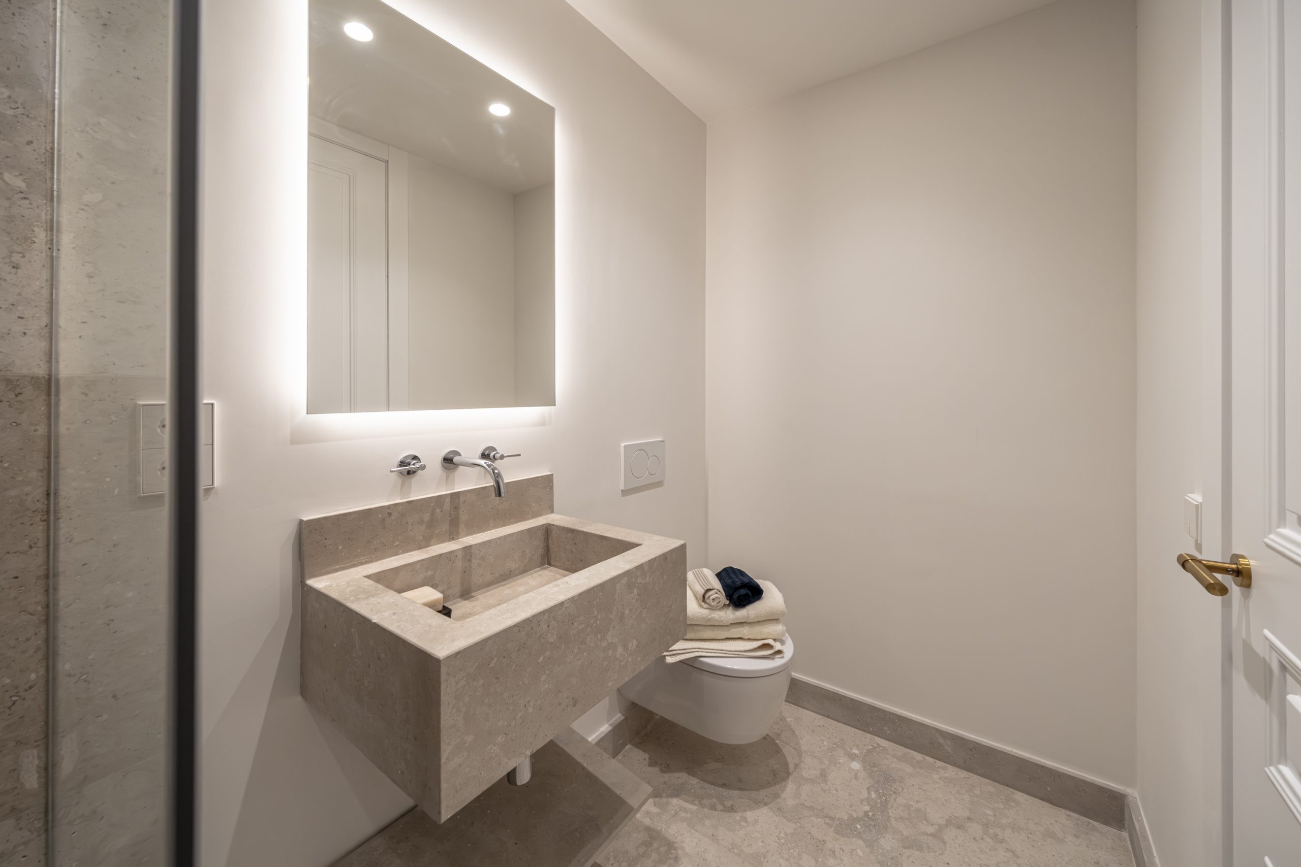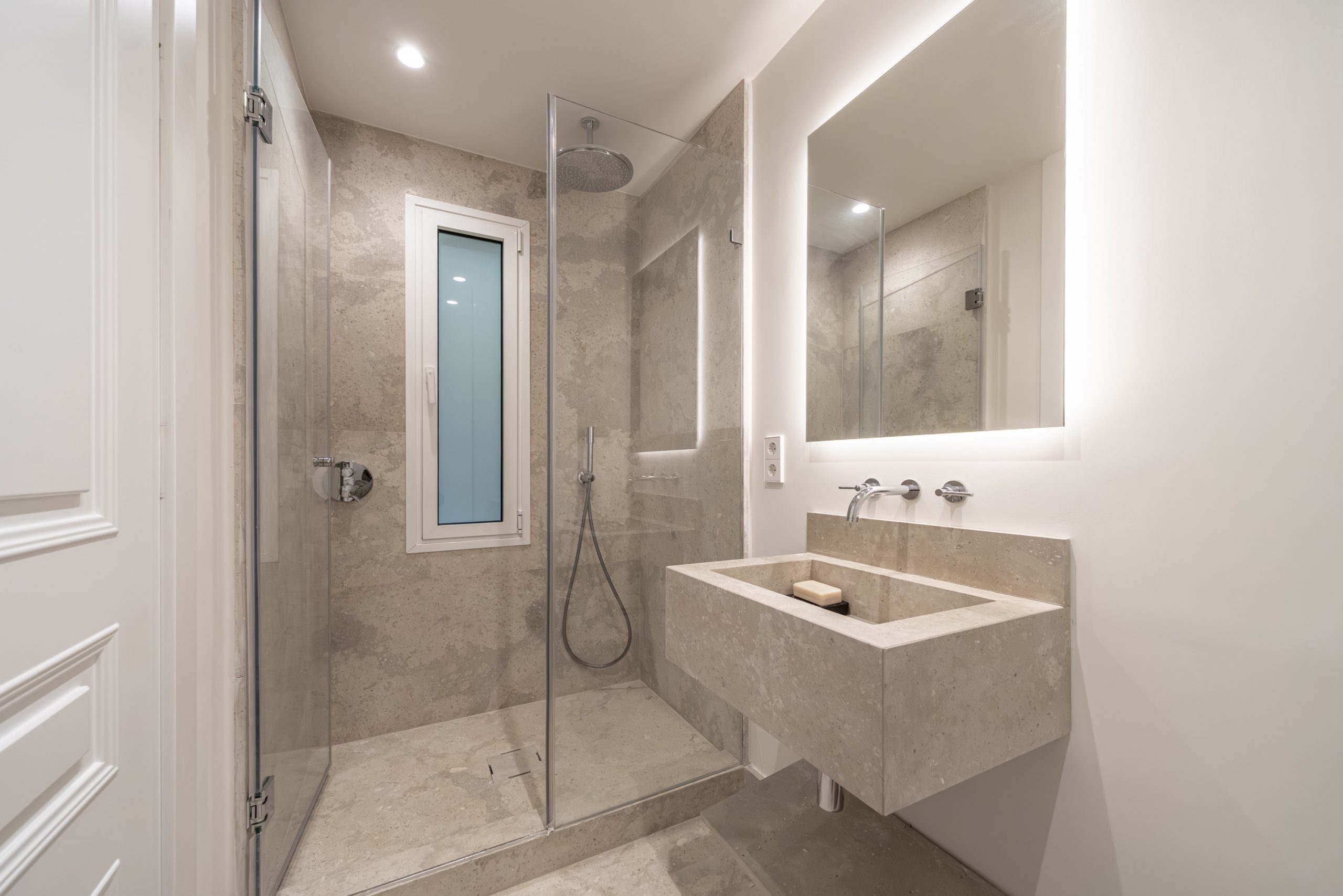 Los cuartos de baño han sido concebidos como auténticos espacios de bienestar. Disponen de duchas de obra revestidas en piedra natural, mamparas de vidrio laminado y templado con perfilería en acero inoxidable, griferías empotradas Grohe modelo Atrio, inodoros suspendidos Duravit con cisterna empotrada y muebles de baño con frentes en roble natural. Destacan las encimeras en mármol Negro Marquina y piedra de Campaspero, así como los espejos retroiluminados.