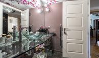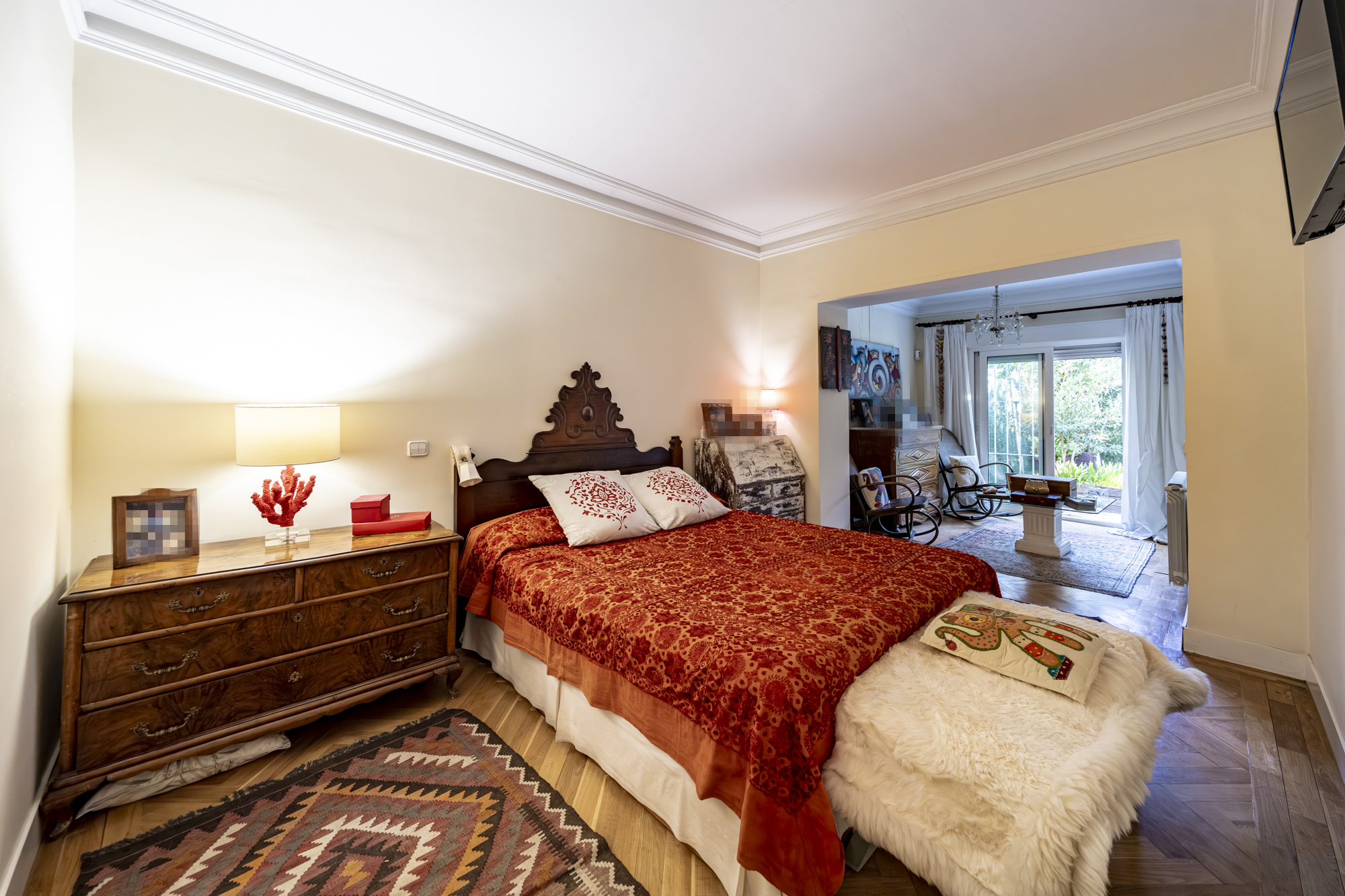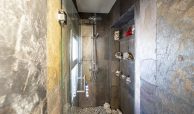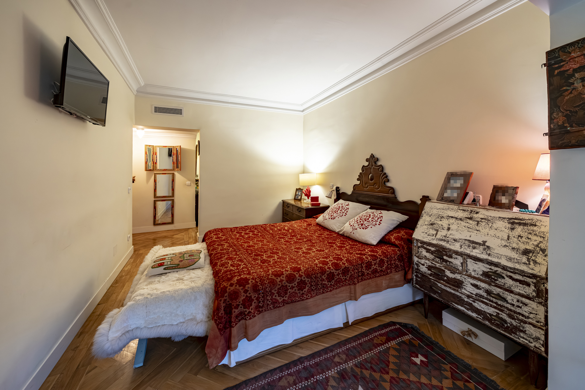 Dormitorio principal tipo suite, con armario empotrado lacado en blanco y baño privado con plato de ducha.