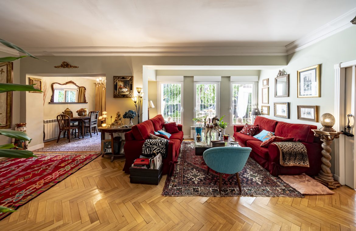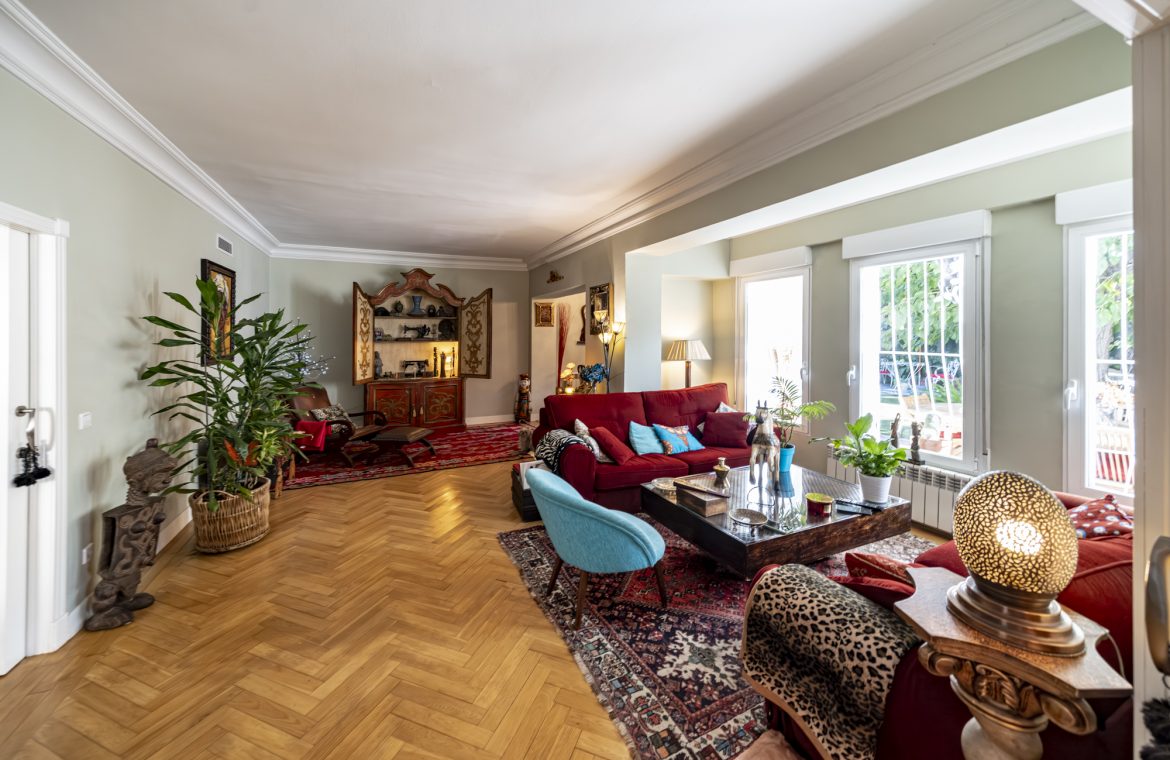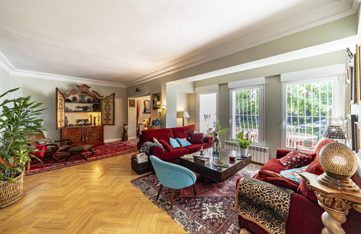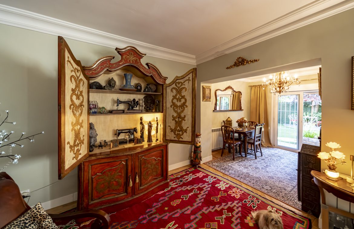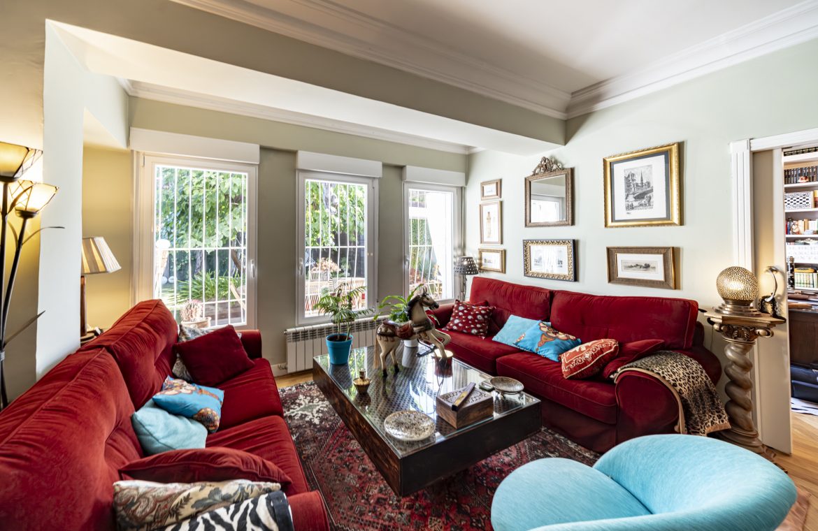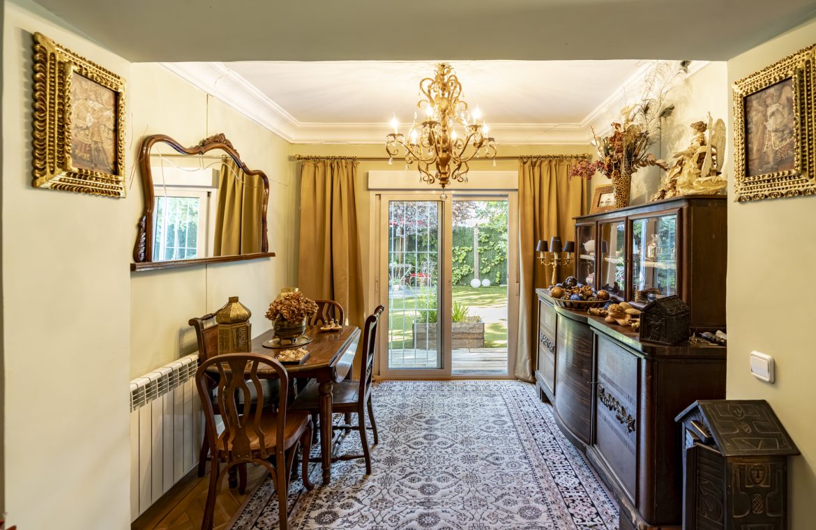 Salón-comedor en forma de L con tiro para chimenea y salida directa a un espectacular jardín de 140m2, ideal para disfrutar todo el año.