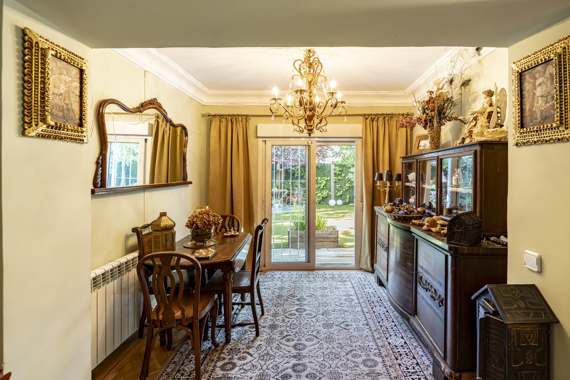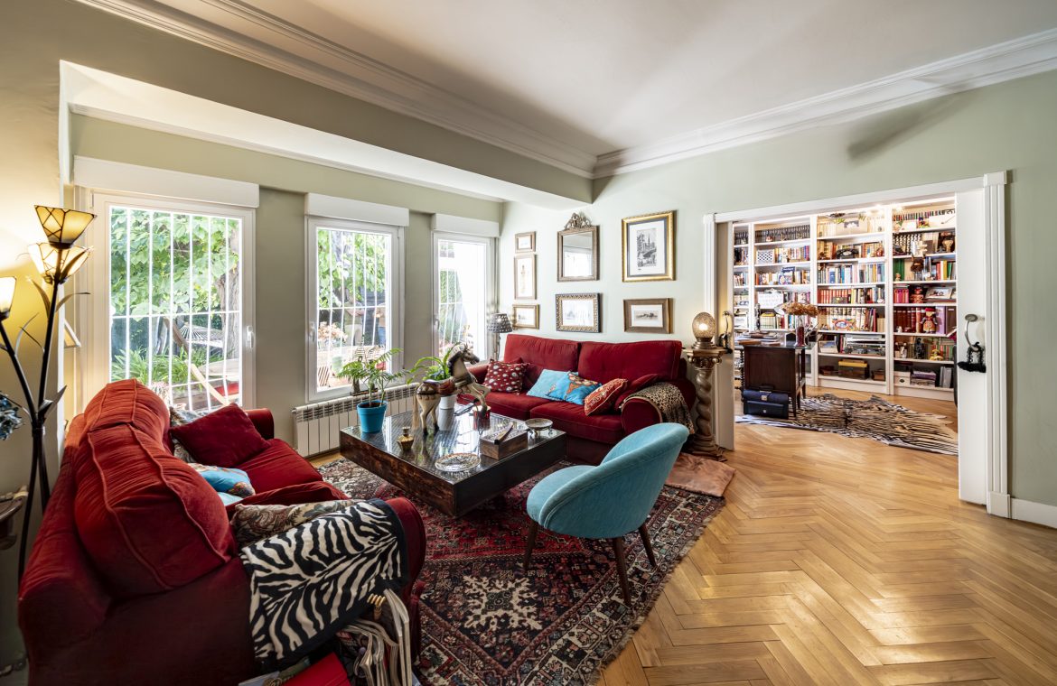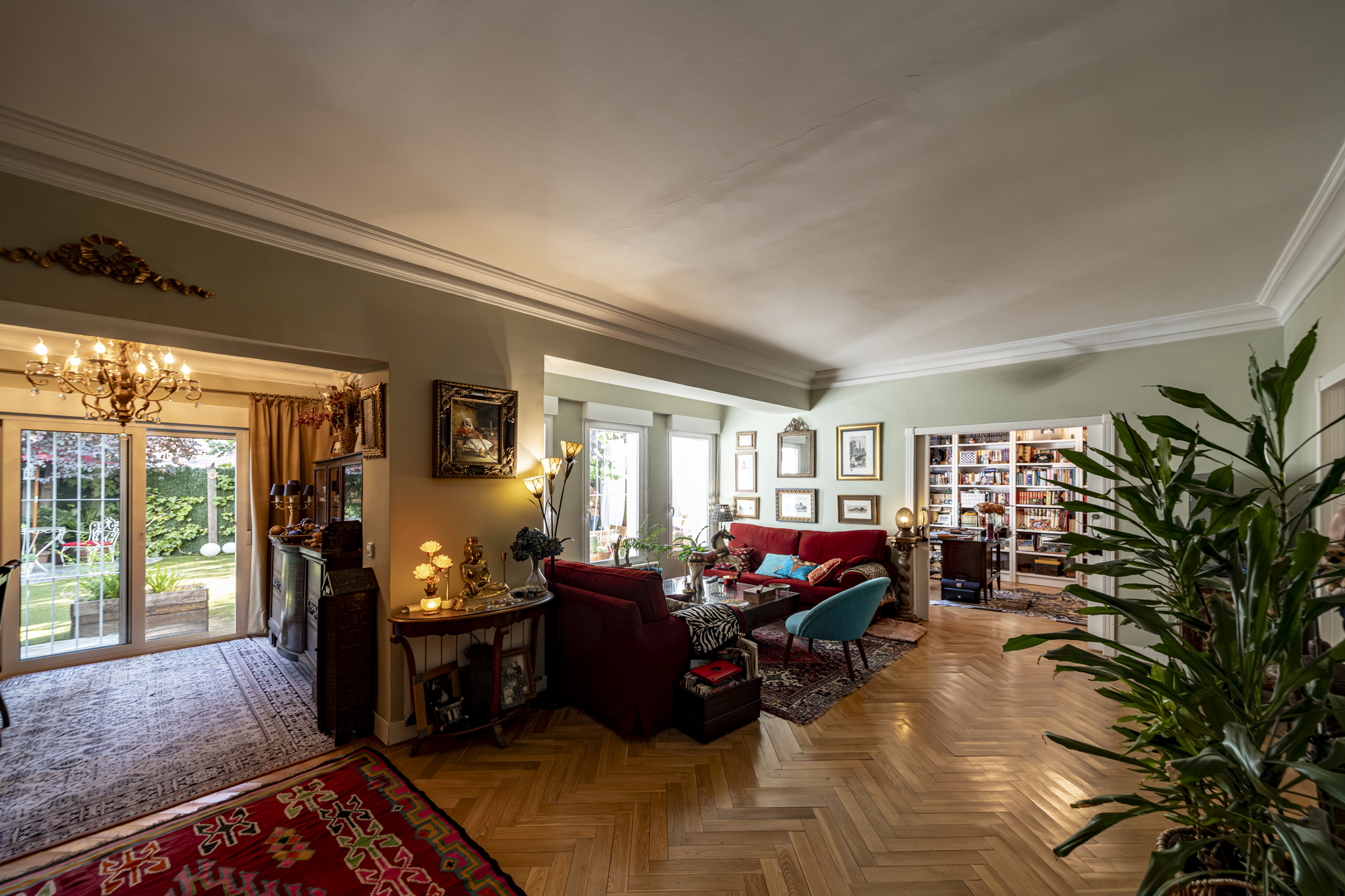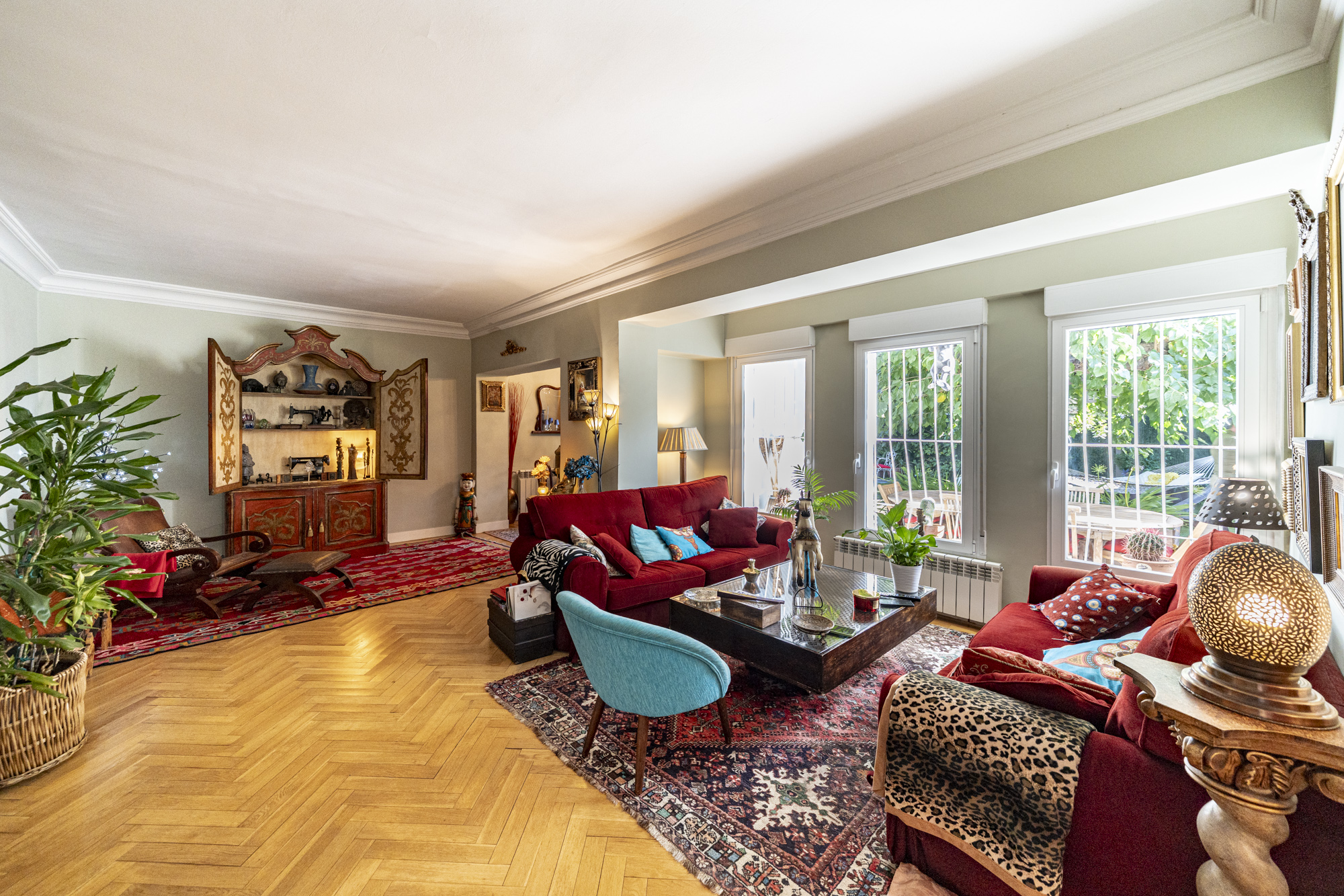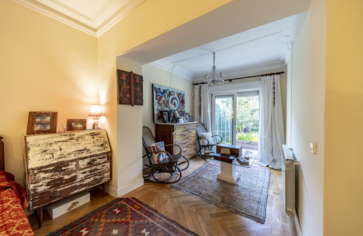 Salón-comedor en forma de L con tiro para chimenea y salida directa a un espectacular jardín de 140m2, ideal para disfrutar todo el año.