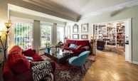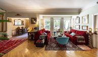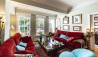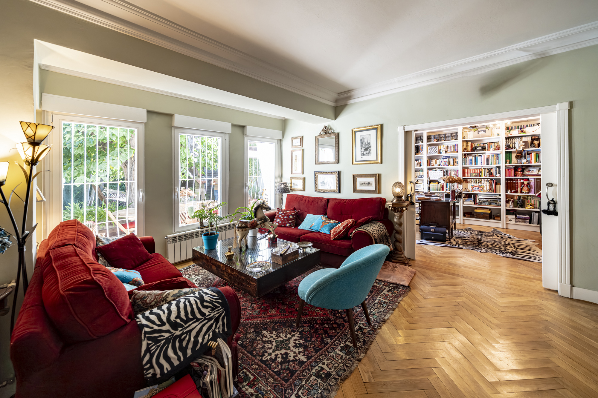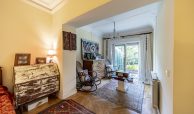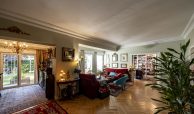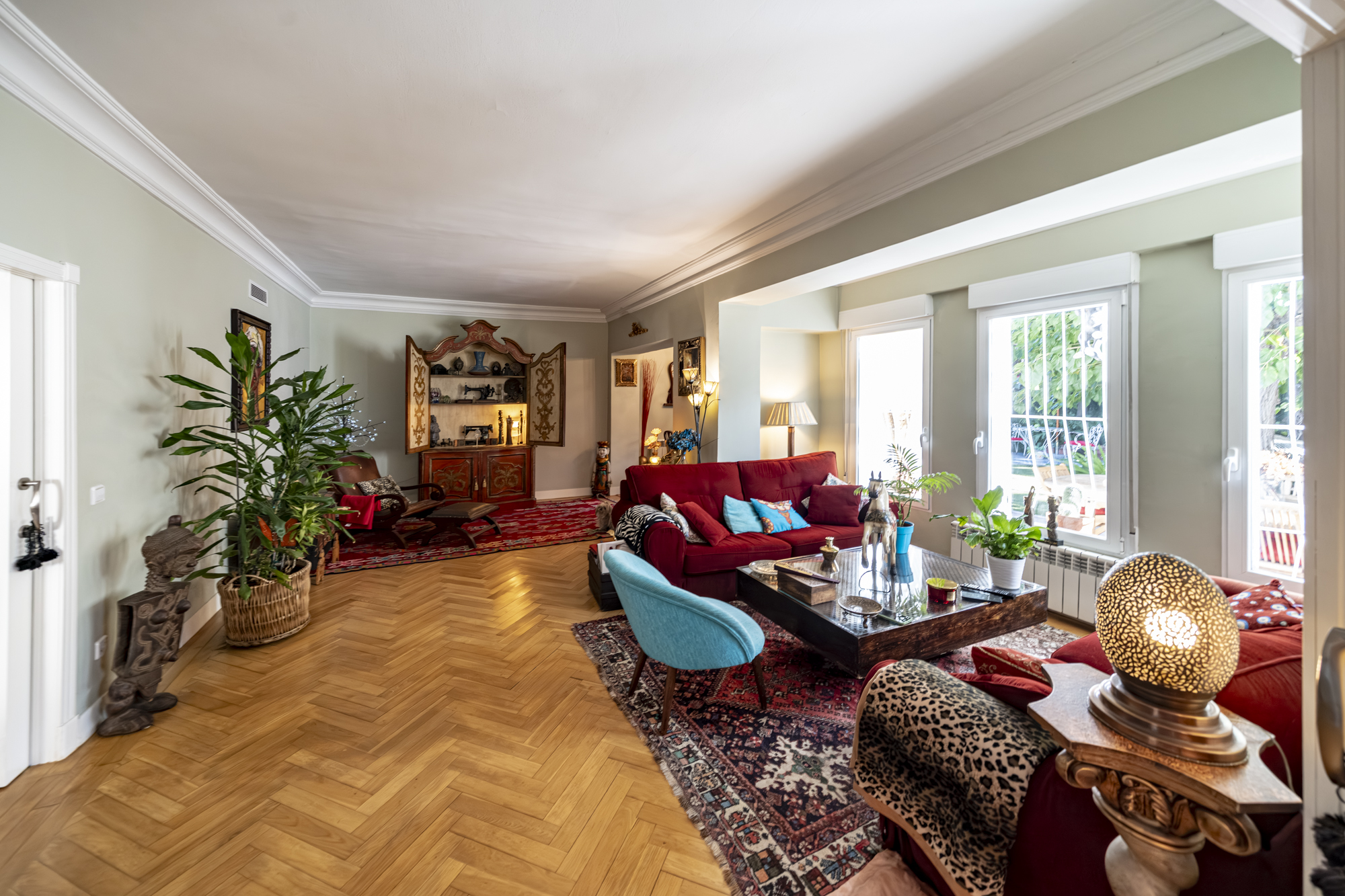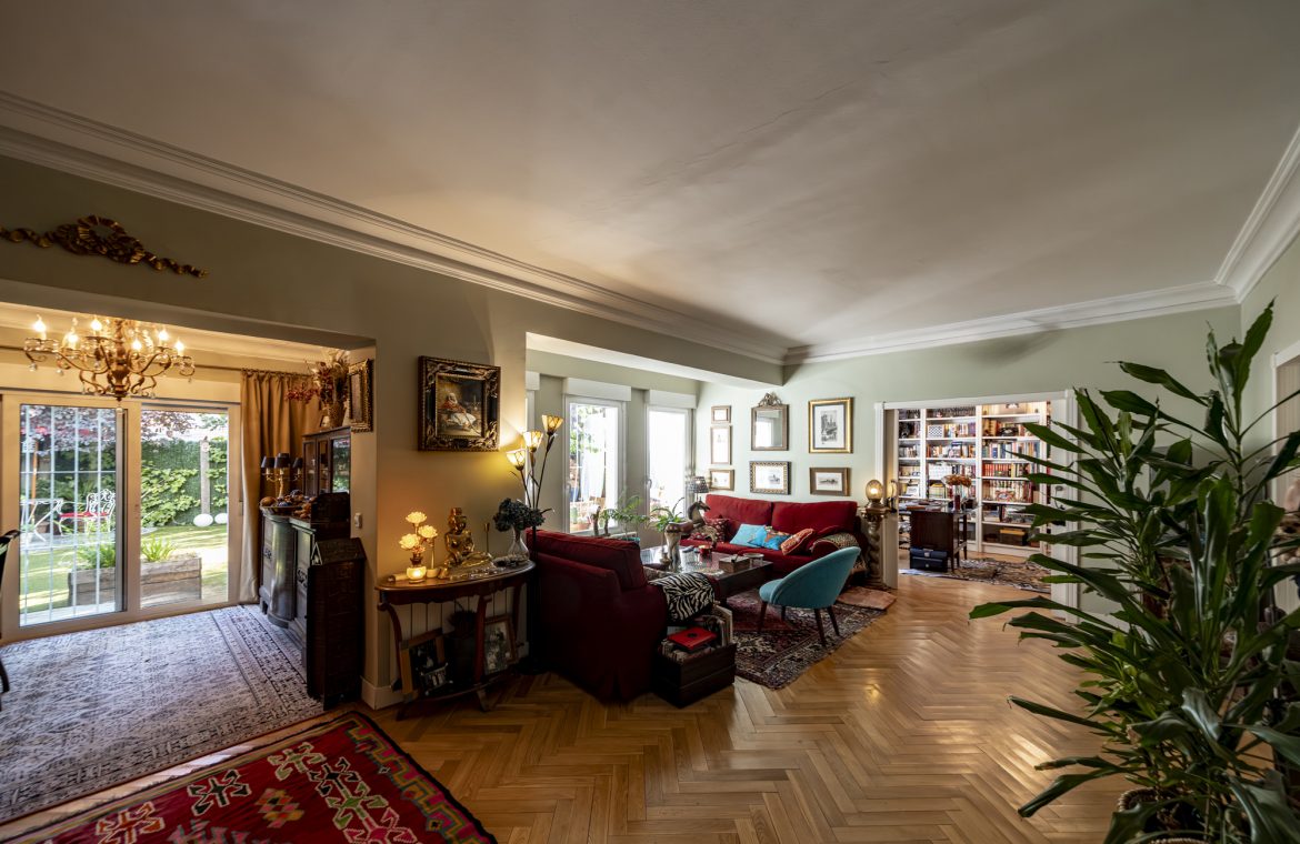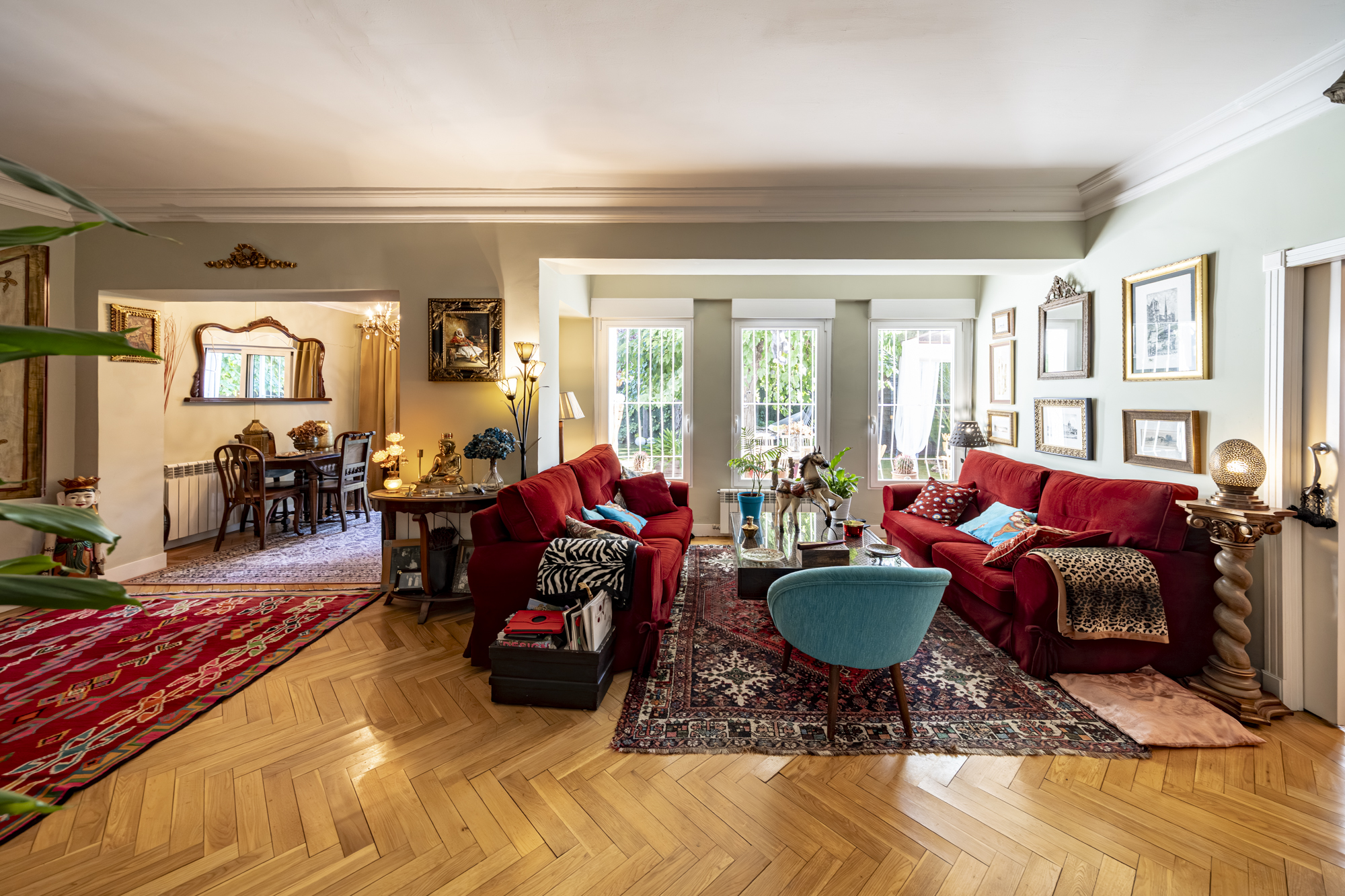 Salón-comedor en forma de L con tiro para chimenea y salida directa a un espectacular jardín de 140m2, ideal para disfrutar todo el año.