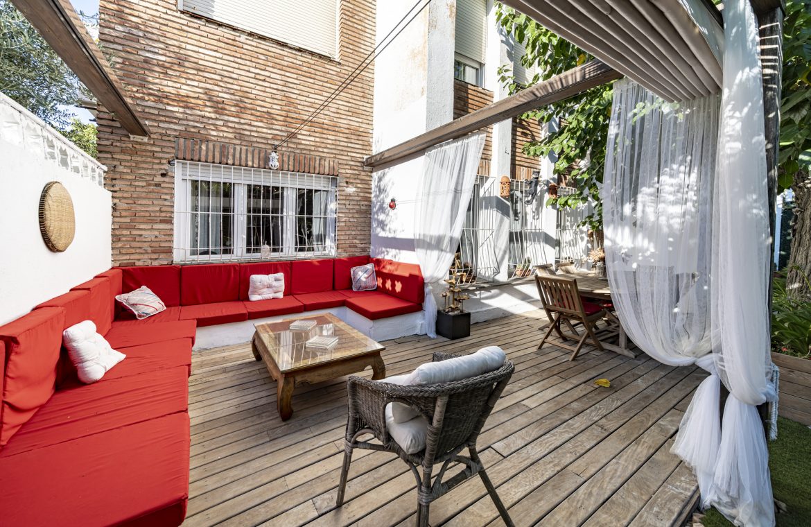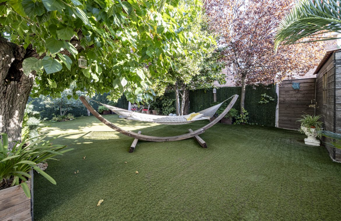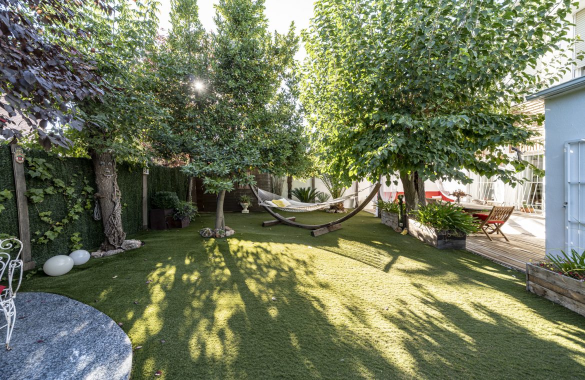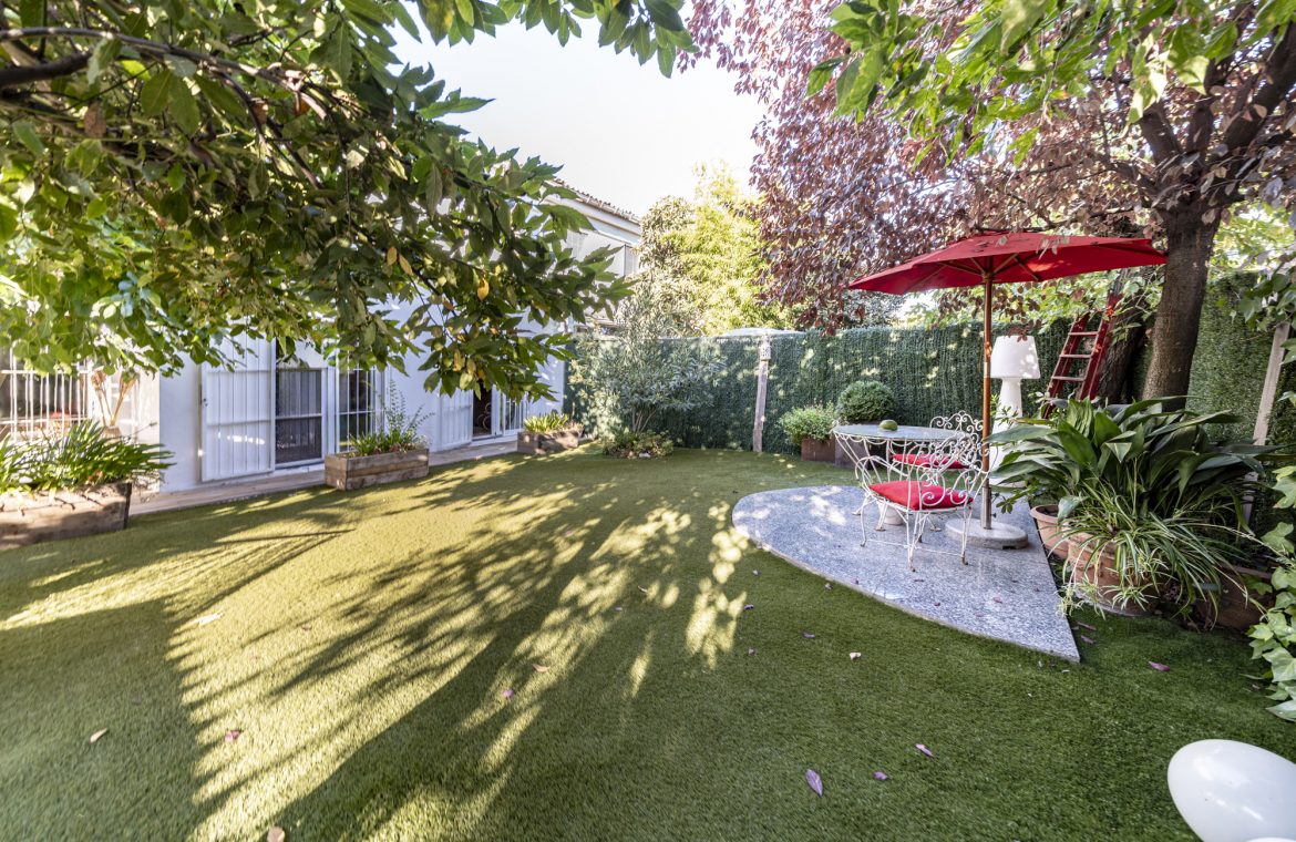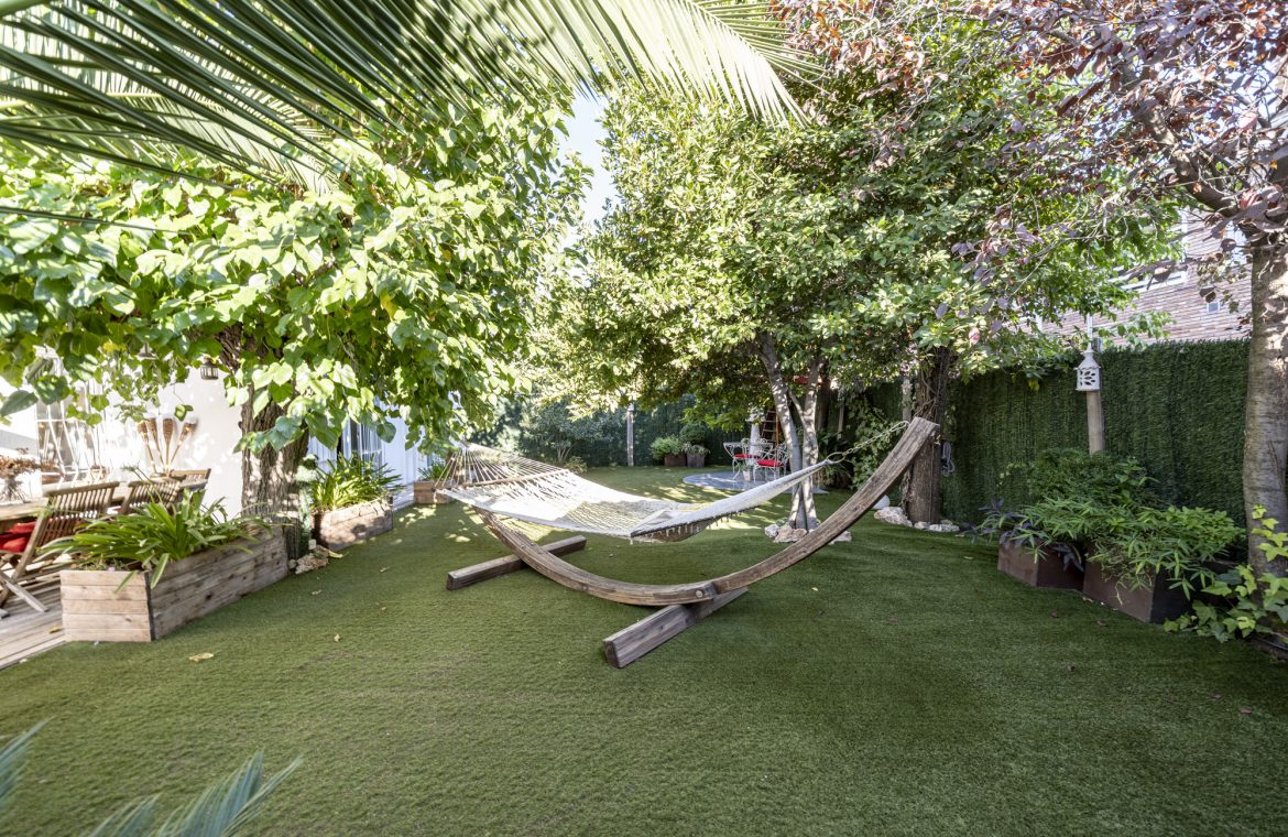 El jardín privado es el verdadero protagonista: totalmente acondicionado con rinconera, pérgola, césped artificial y zonas ajardinadas con sombra, perfecto para reuniones familiares, ocio y relax.