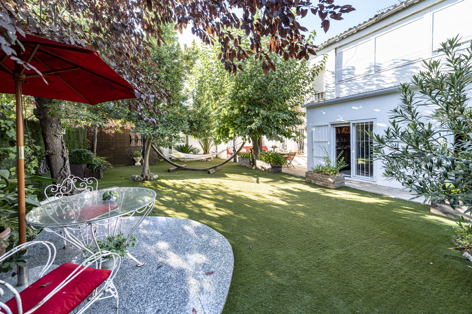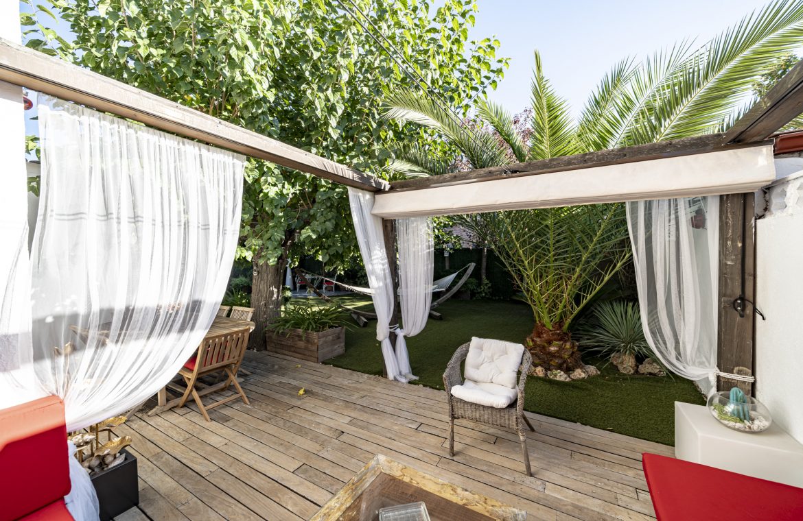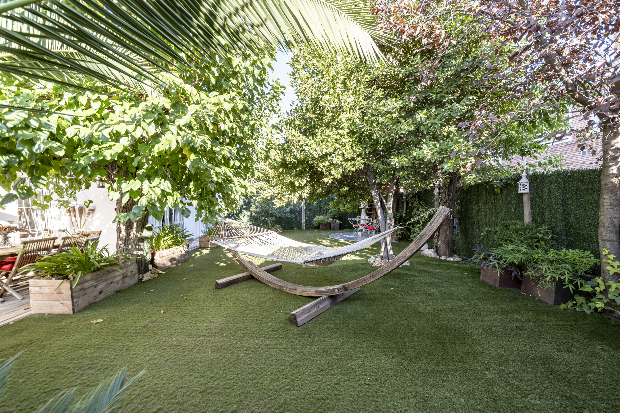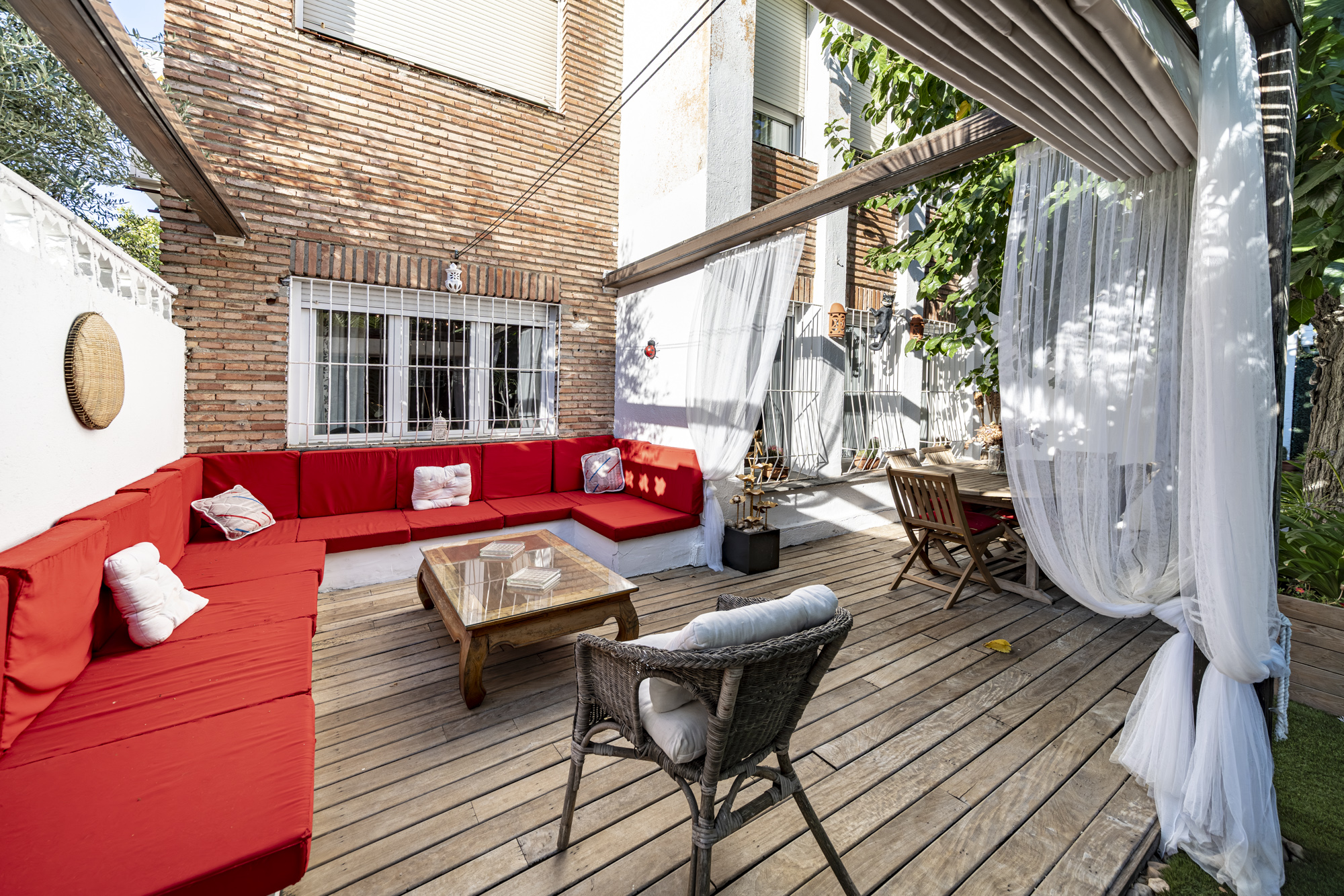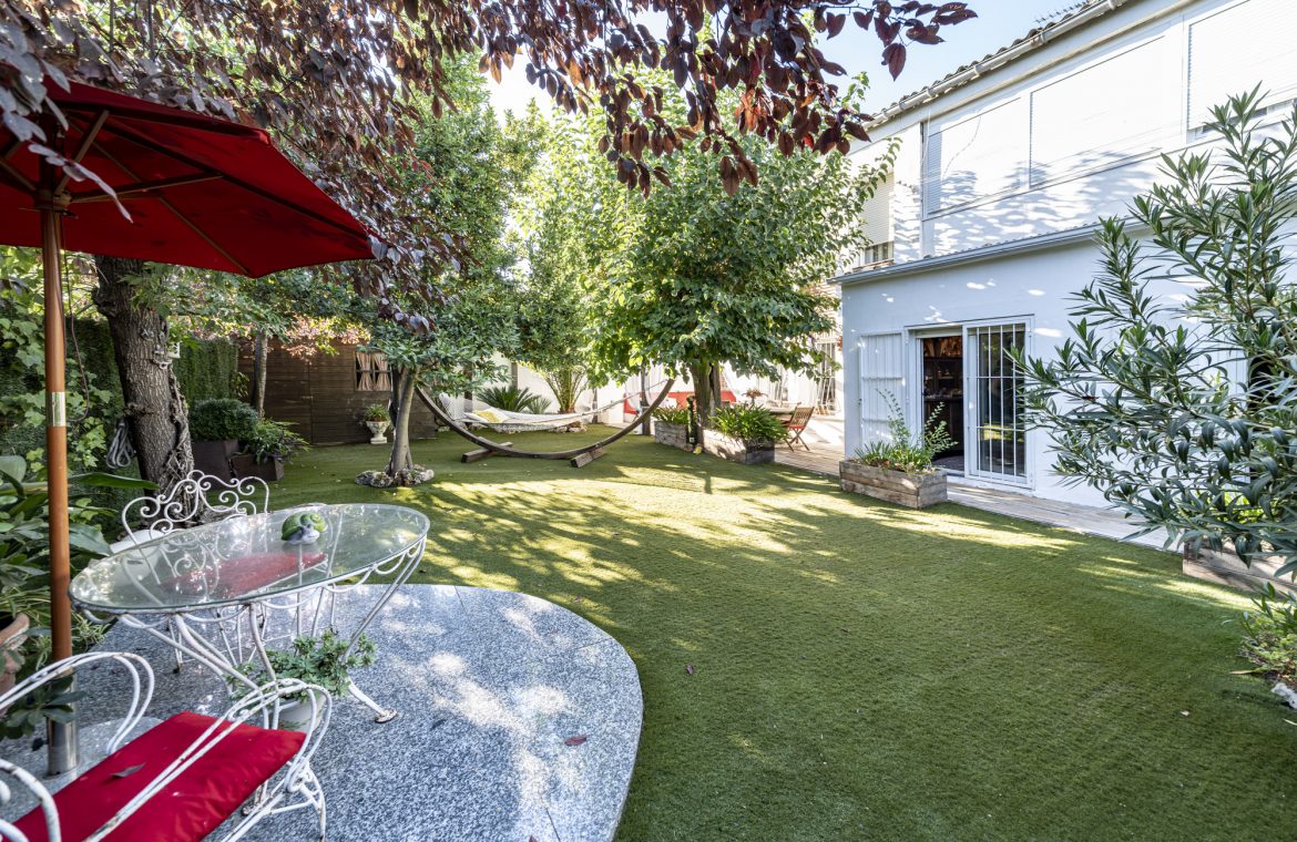 El jardín privado es el verdadero protagonista: totalmente acondicionado con rinconera, pérgola, césped artificial y zonas ajardinadas con sombra, perfecto para reuniones familiares, ocio y relax.