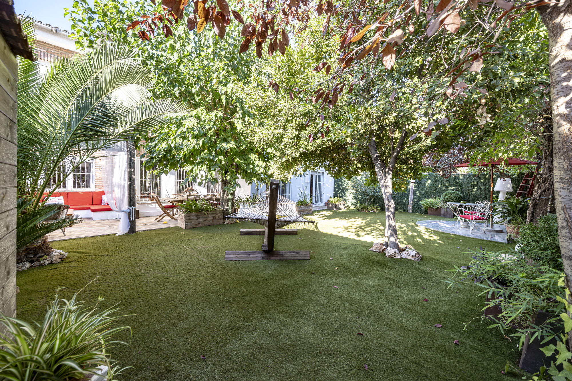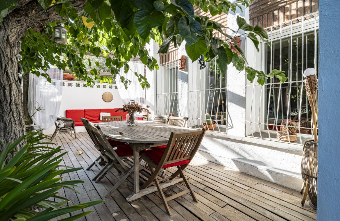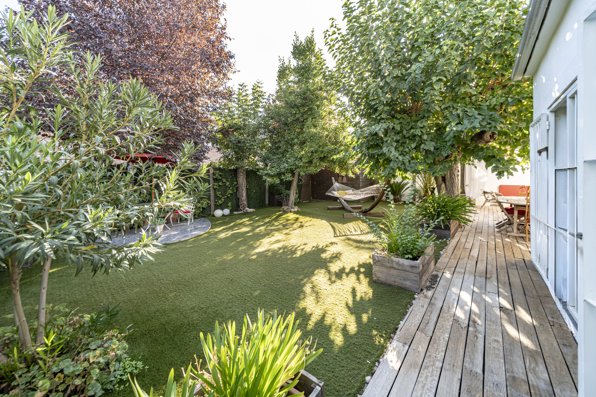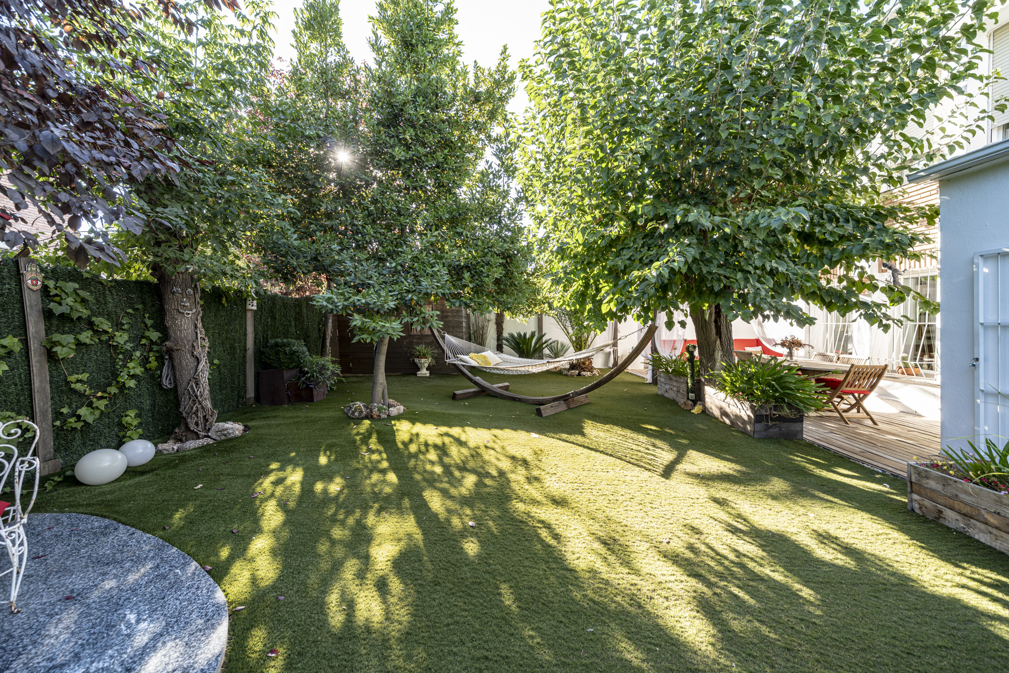 El jardín privado es el verdadero protagonista: totalmente acondicionado con rinconera, pérgola, césped artificial y zonas ajardinadas con sombra, perfecto para reuniones familiares, ocio y relax.